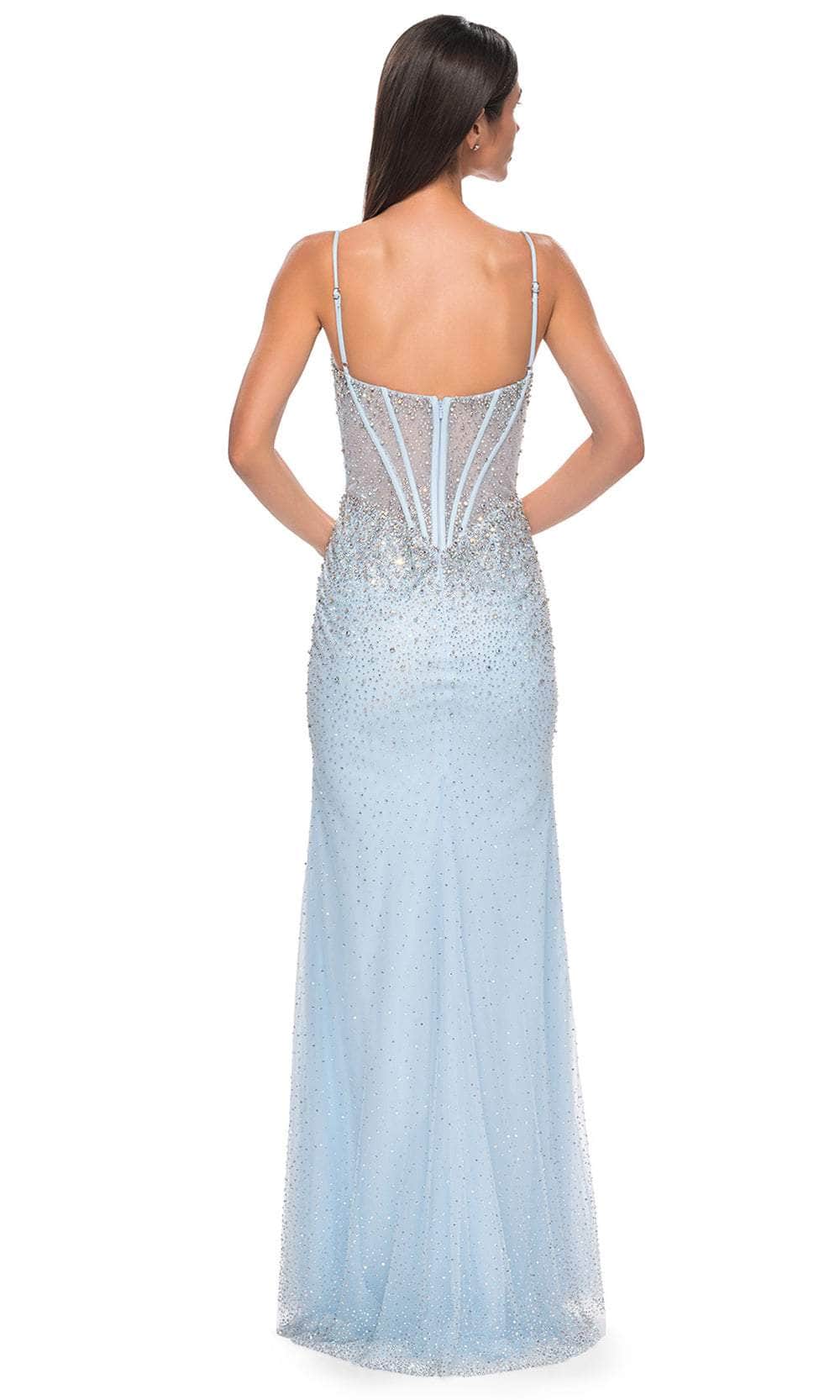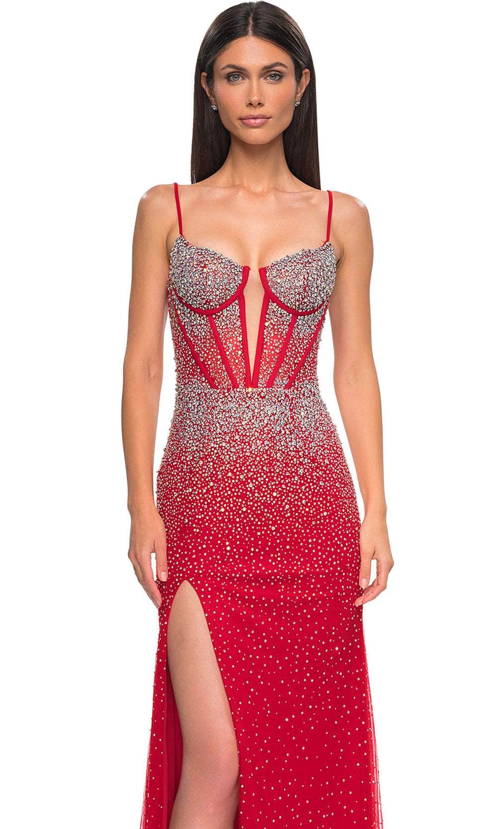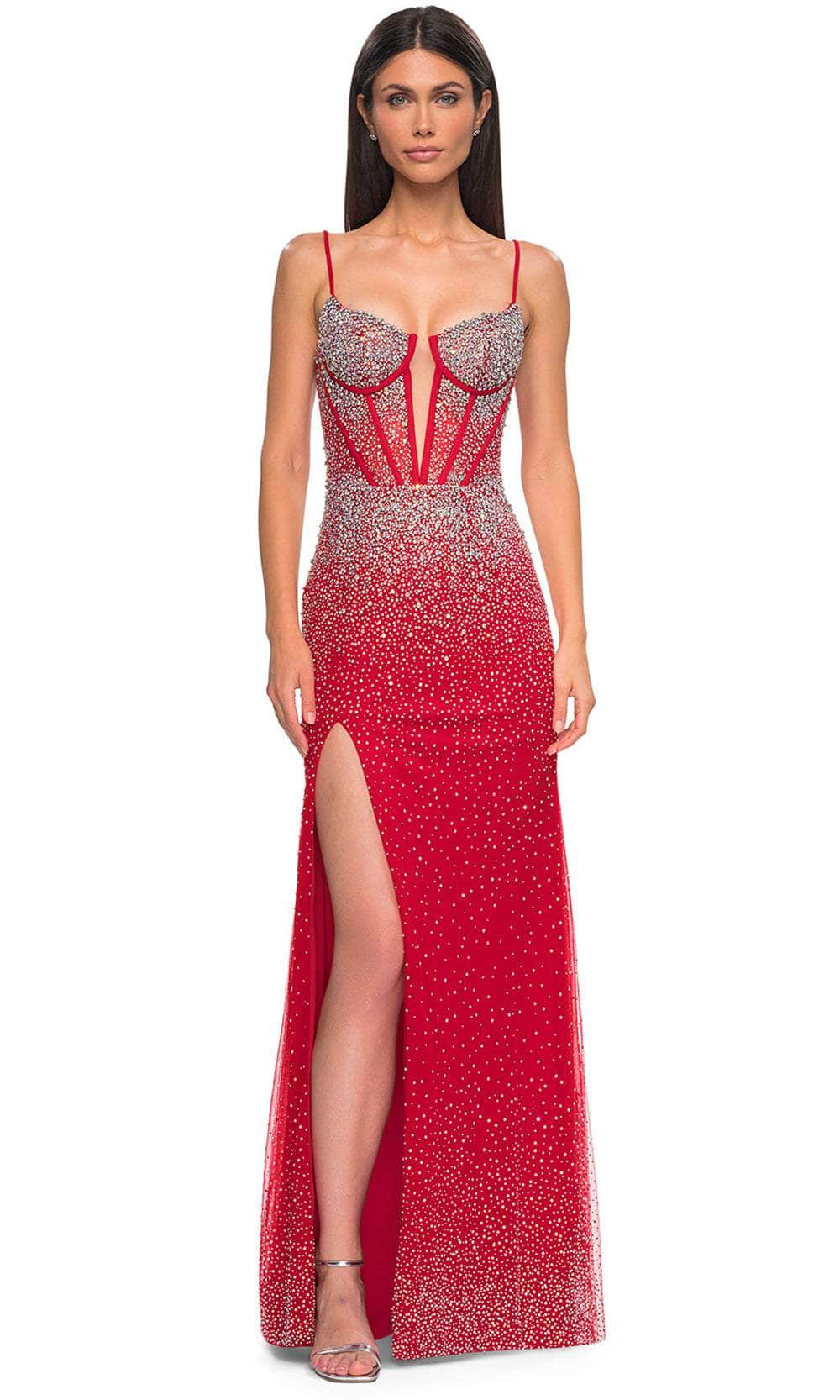 Charm everyone from all angles as you shine all throughout the occasion in this La Femme 32717 prom dress, a gorgeous fitted gown. This stunning dress is fully embellished with rhinestones, creating a dazzling and glamorous look. The sleeveless corset bodice is adorned with rhinestones and features a deep V mesh neckline, adding a touch of elegance and allure. The floor-length skirt flows gracefully and is accented with a high slit, ensuring a dramatic and enchanting silhouette. The back zipper closure provides ease and security. Infuse your special event with stellar style in this La Femme 32717. Models are wearing Black, Red, Pale Yellow, Light Blue, and Black colors.