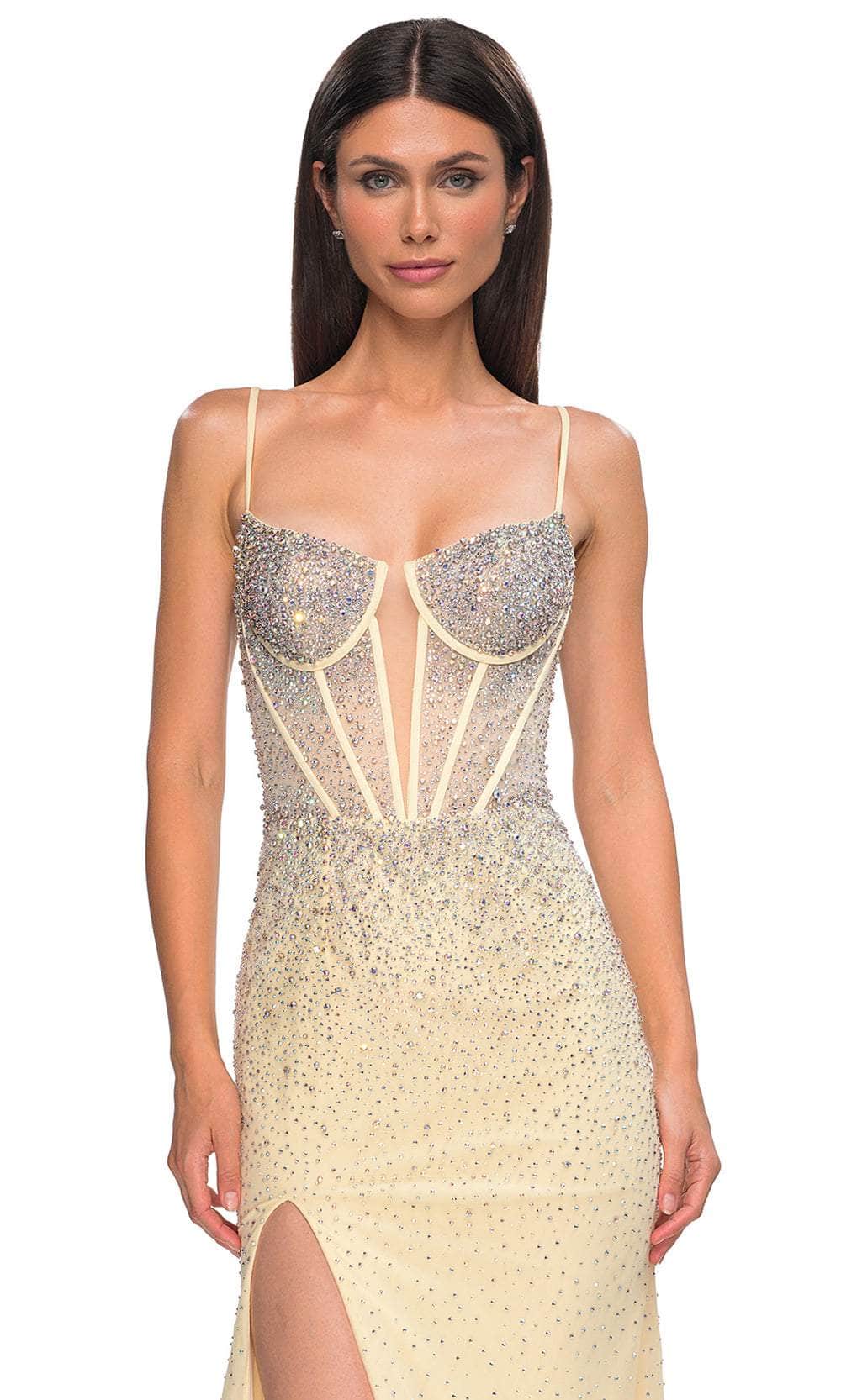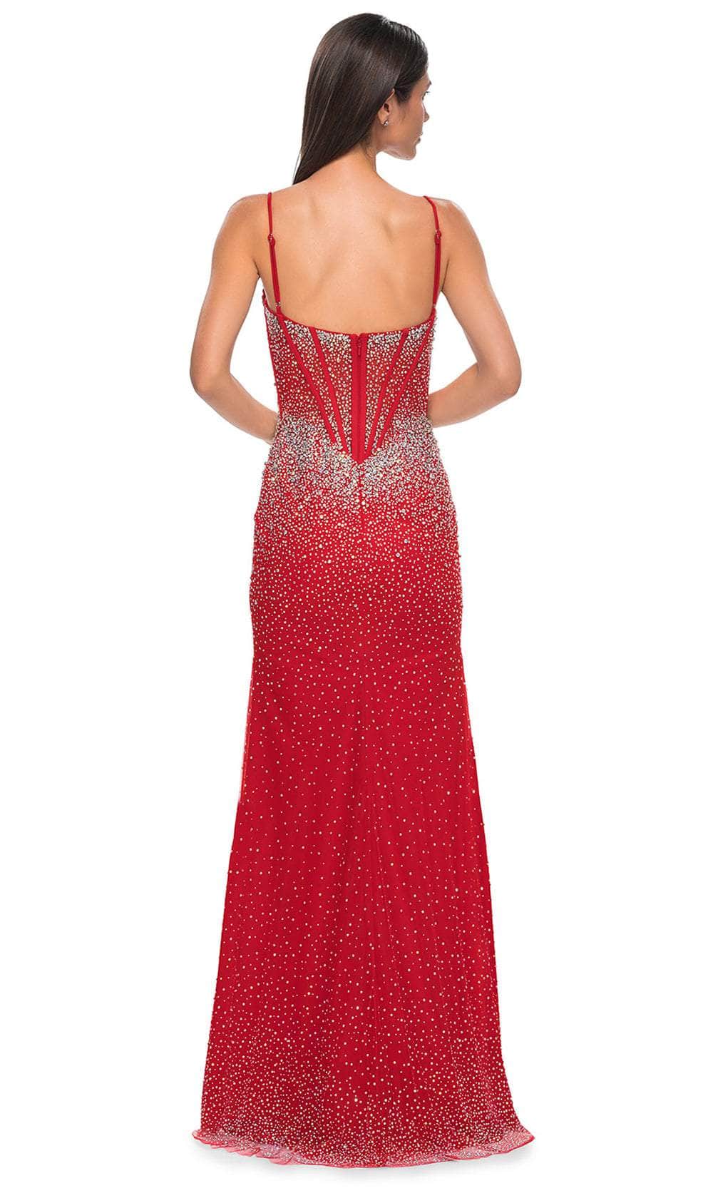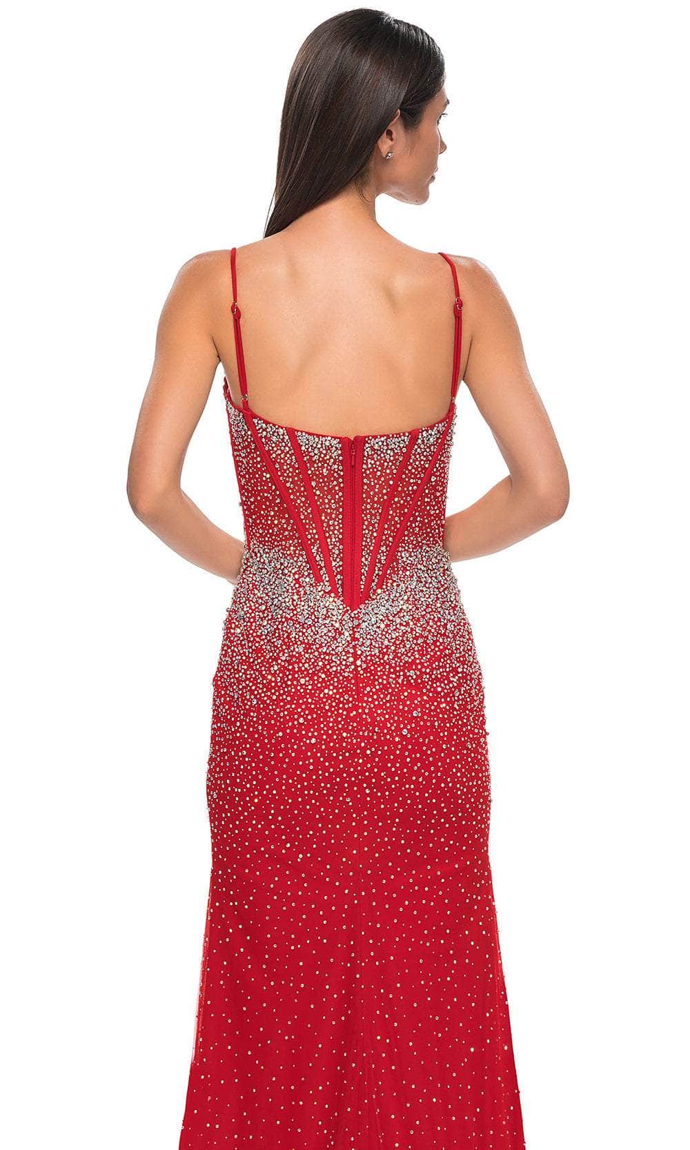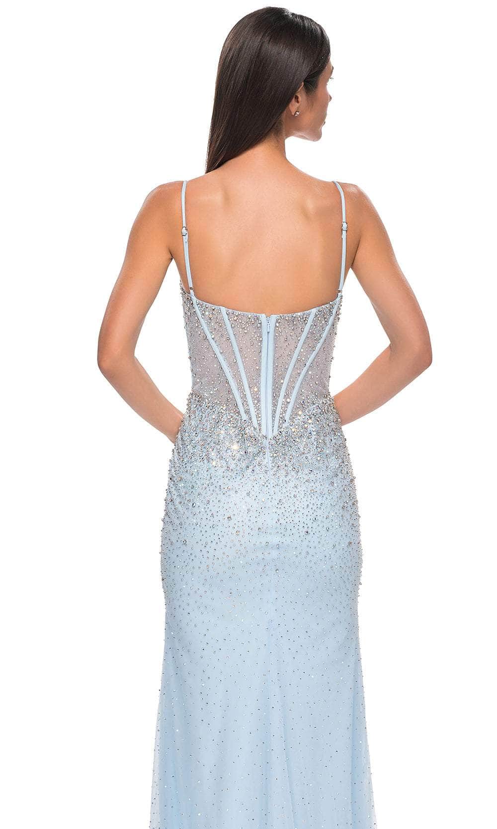Charm everyone from all angles as you shine all throughout the occasion in this La Femme 32717 prom dress, a gorgeous fitted gown. This stunning dress is fully embellished with rhinestones, creating a dazzling and glamorous look. The sleeveless corset bodice is adorned with rhinestones and features a deep V mesh neckline, adding a touch of elegance and allure. The floor-length skirt flows gracefully and is accented with a high slit, ensuring a dramatic and enchanting silhouette. The back zipper closure provides ease and security. Infuse your special event with stellar style in this La Femme 32717. Models are wearing Black, Red, Pale Yellow, Light Blue, and Black colors.