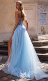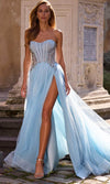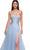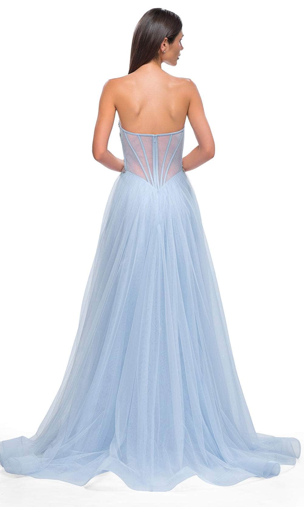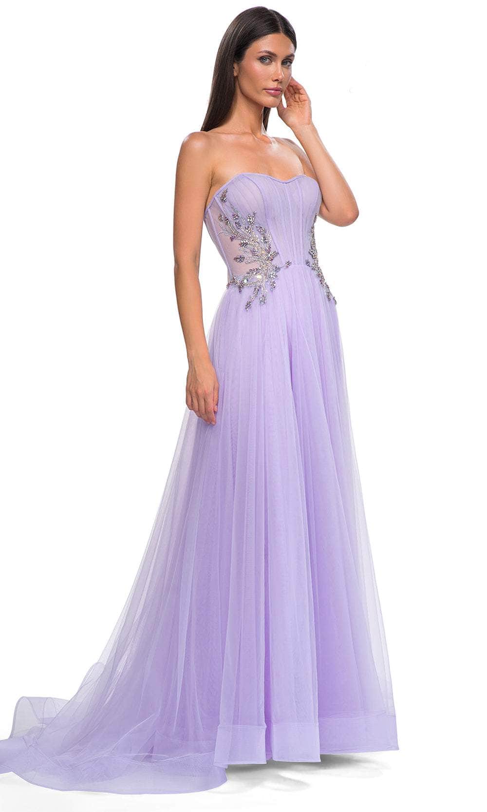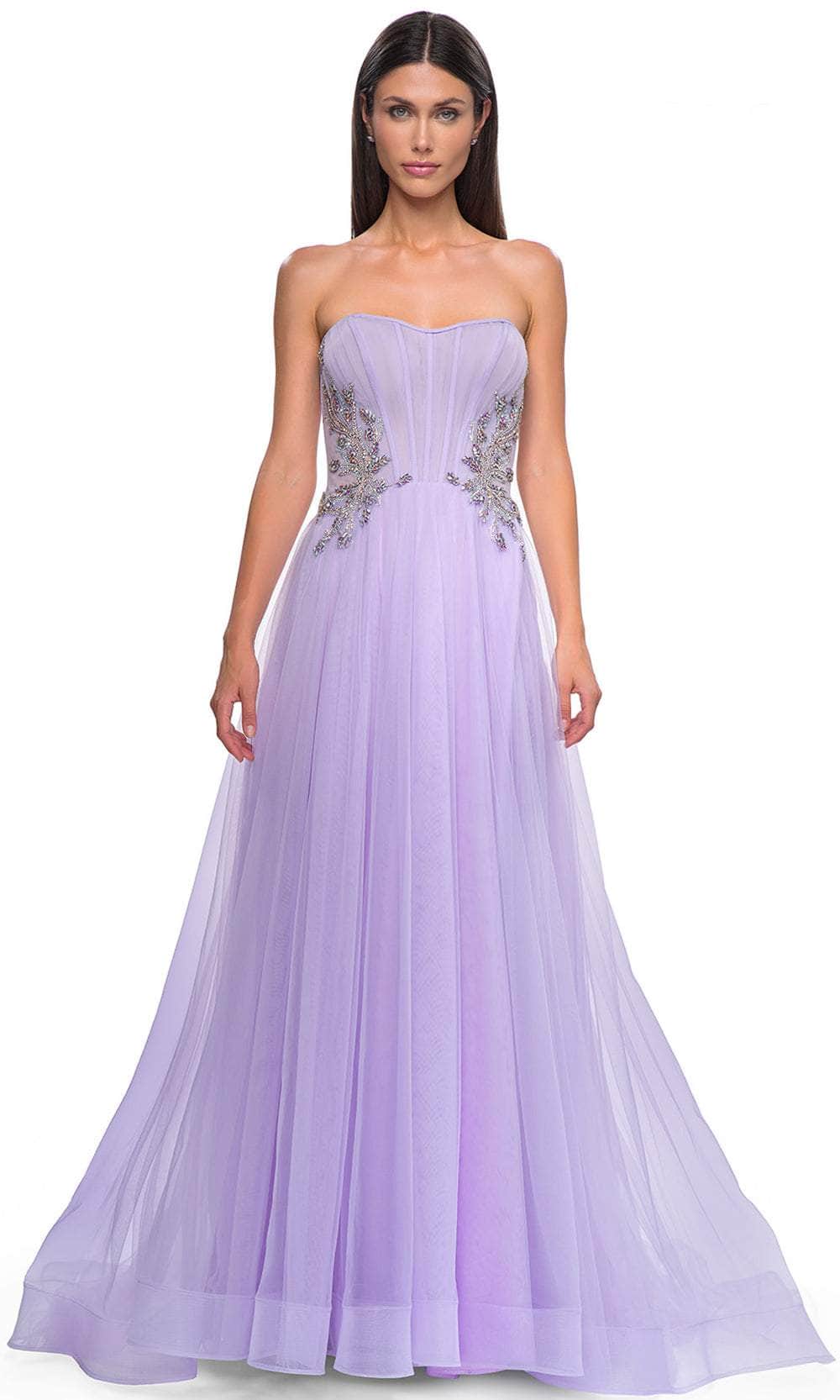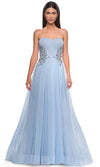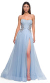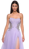 Get noticed in this La Femme 32767 prom dress, a gorgeous A-line tulle gown designed to captivate. This beautiful dress features a full skirt with a high slit, offering a blend of elegance and allure. The strapless illusion bodice is adorned with exposed boning and a stunning rhinestone pattern detail on the sides of the waist, adding a touch of sparkle and sophistication. The horsehair hem enhances the dress's graceful flow, while the floor-length skirt ends with a train for a dramatic finish. The back zipper closure ensures a secure and comfortable fit. Perfect for prom or any formal occasion, this La Femme 32767 combines timeless beauty with modern style, making you the highlight of the evening. Models are wearing Lavender and Cloud Blue colors.
