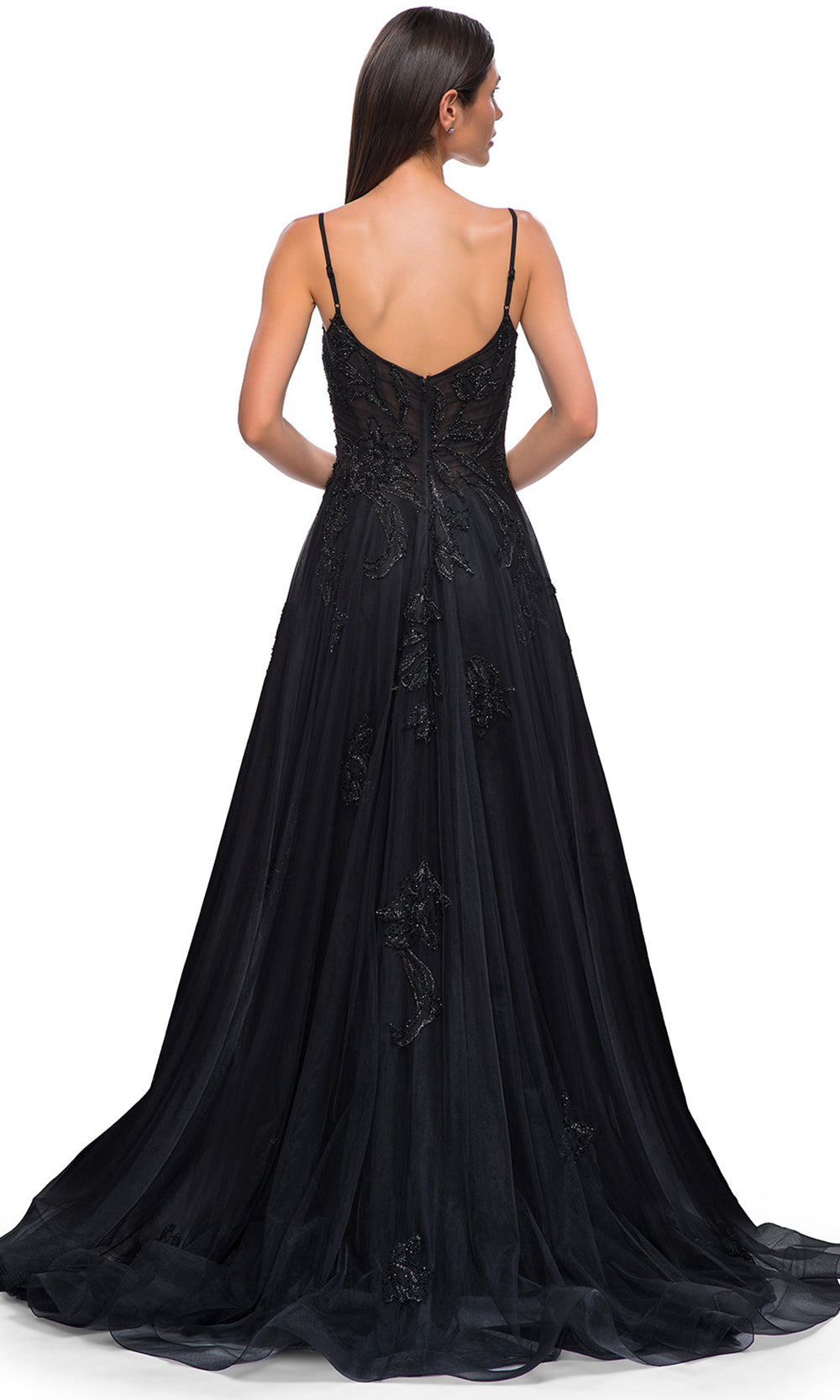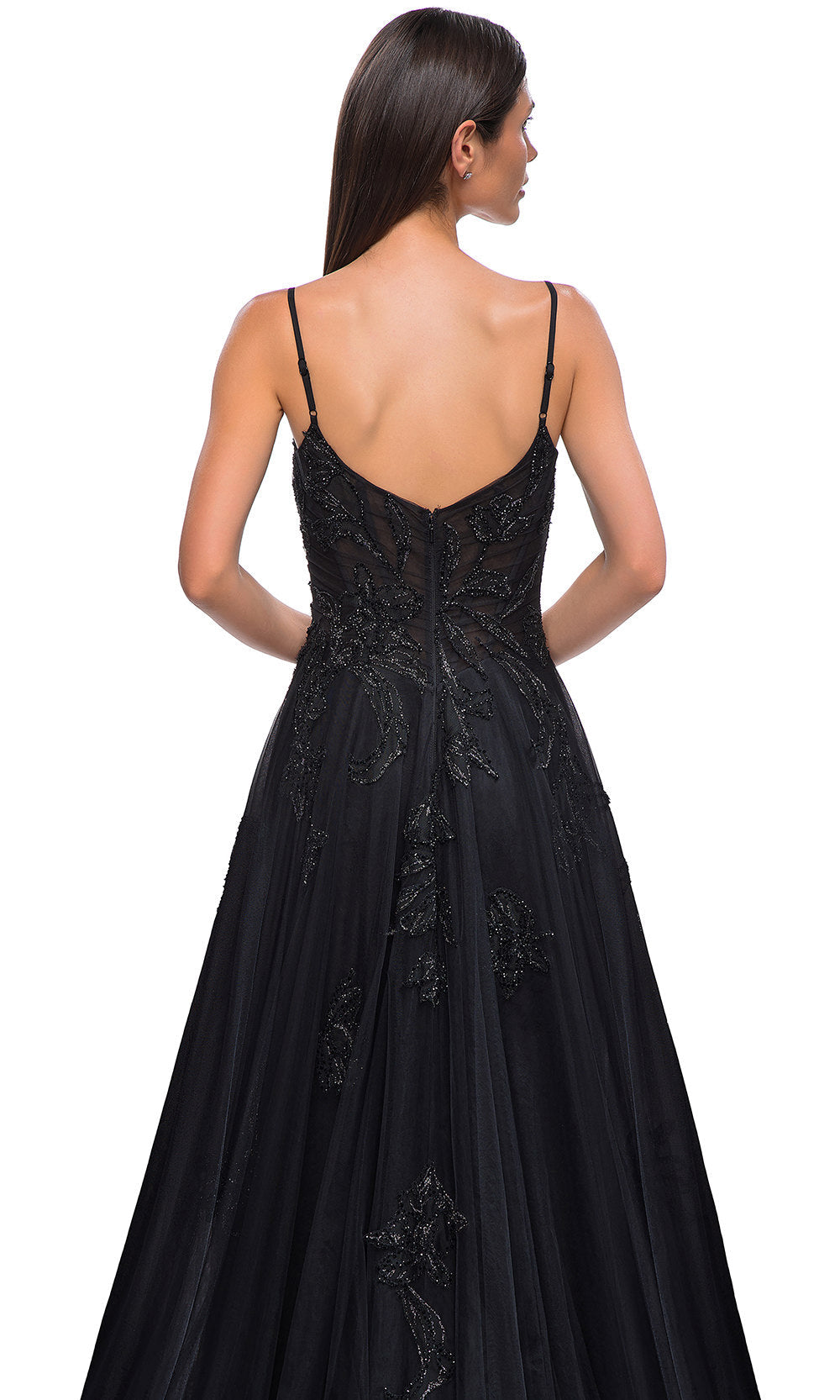 Embrace elegance with the La Femme 32781 gown. This absolutely gorgeous A-line dress is adorned with intricate beaded lace applique, creating a stunning and sophisticated look. The illusion sleeveless top features delicate ruching and exposed boning, adding a touch of modern flair. The dress is secured with a back zipper closure for a seamless fit. The floor-length A-line skirt flows beautifully, making it perfect for twirling on the dance floor. Ideal for prom or any formal occasion, the La Femme 32781 dress combines timeless elegance with contemporary design, ensuring you make a lasting impression. Model is wearing Black color.