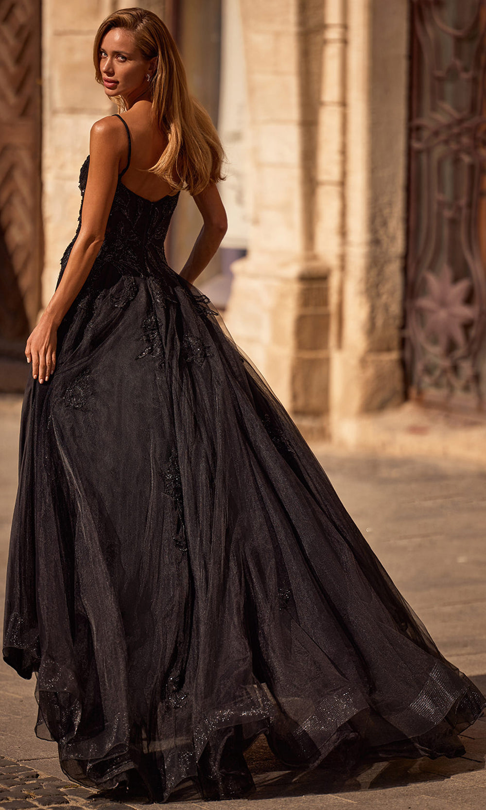 | Details: | Illusion Bodice, Sleeveless, Spaghetti Straps, Back Zipper Closure, Mid-Open Back, Slit, Train |