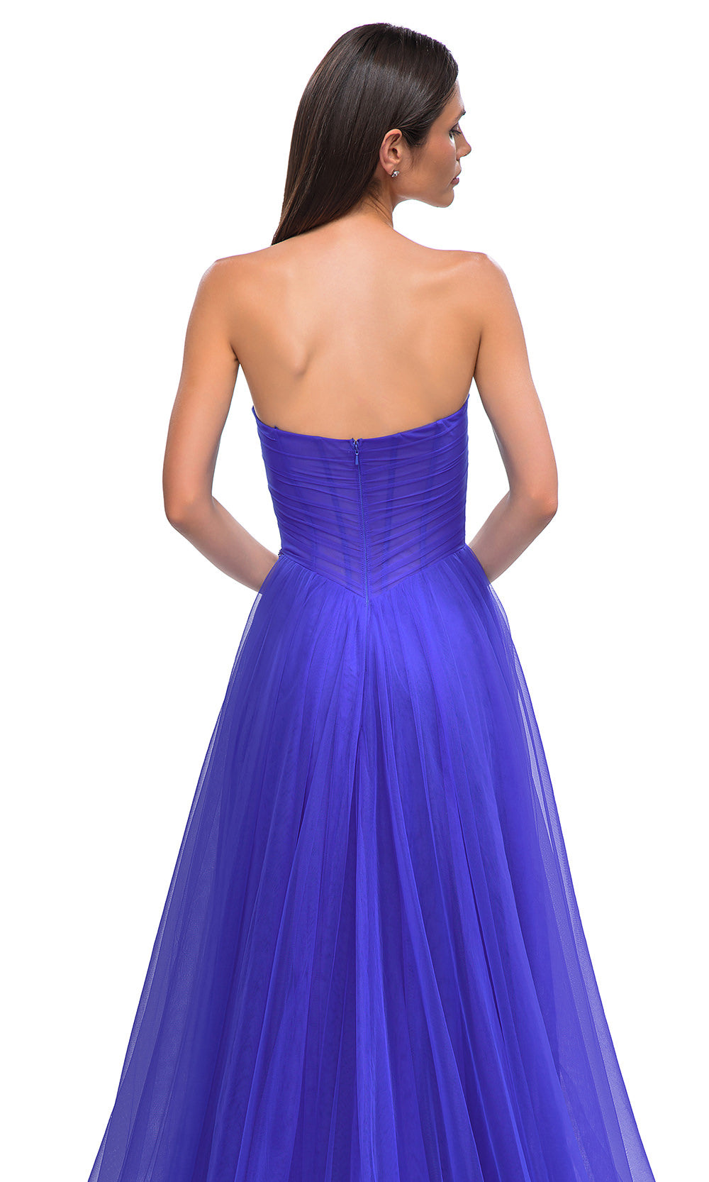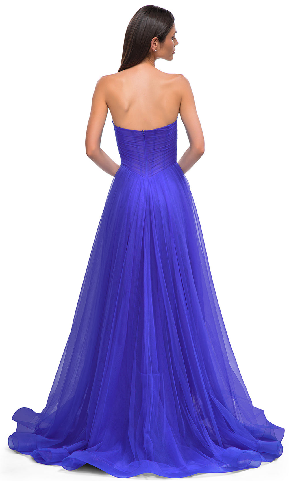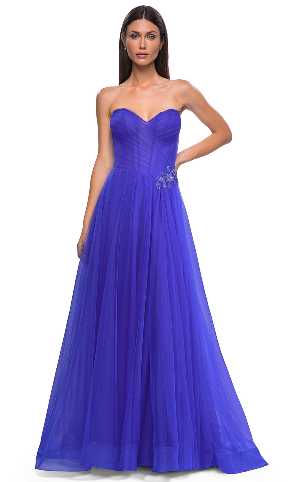 Capture the essence of elegance with the La Femme 32789 prom dress, a stunning A-line gown designed to make a statement. This beautiful dress features a strapless crisscross ruched bodice and a sweetheart neckline, creating a flattering and romantic silhouette. The floor-length skirt is accented with practical pockets, a leg slit, and a horsehair hem, finishing with a graceful train for added drama. The waist is adorned with a delicate rhinestone floral appliqué detail, adding a touch of sparkle and sophistication. The back zipper closure ensures a secure and comfortable fit. La Femme 32789 combines timeless charm with modern elegance, ensuring you shine brightly and leave a lasting impression. Model is wearing Black color.