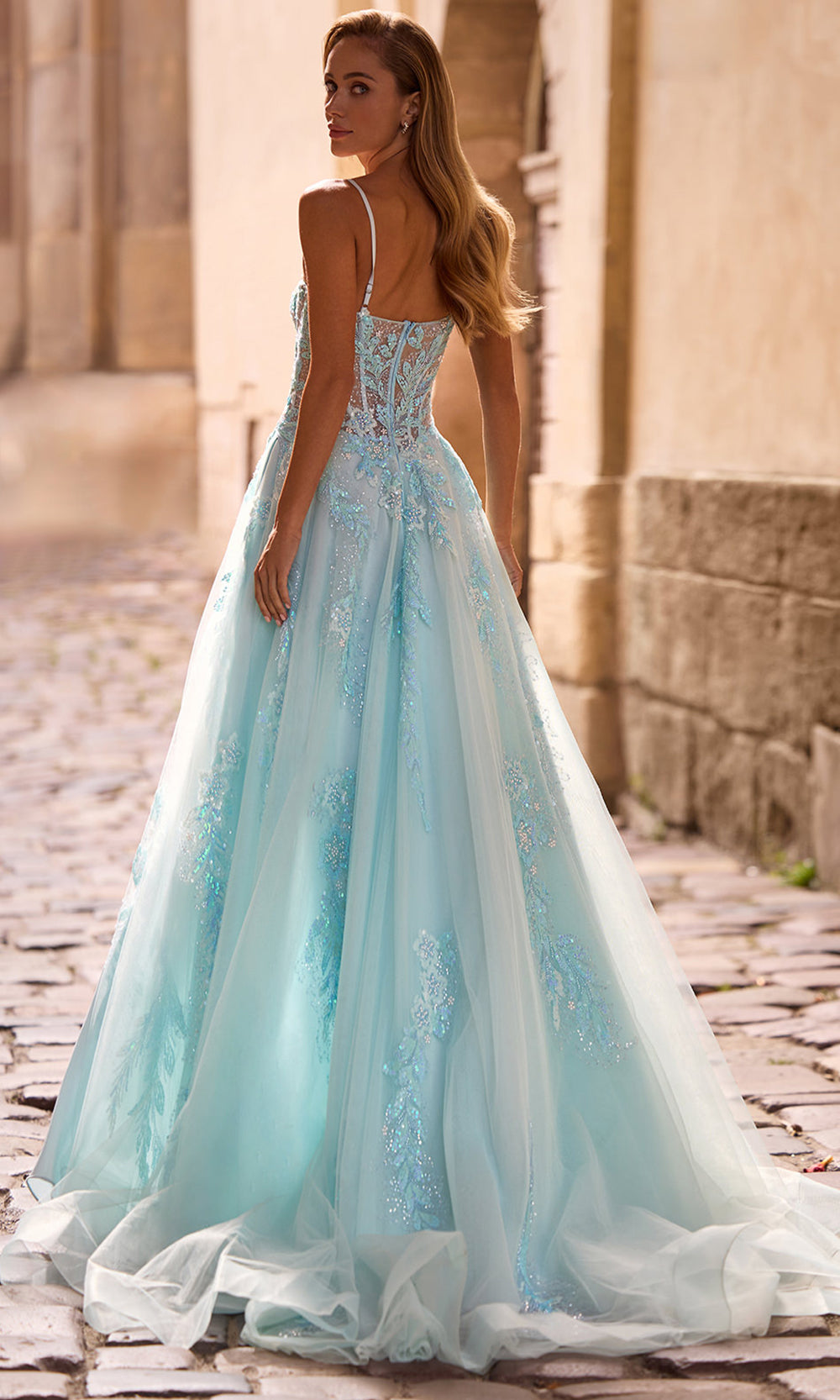 Be sexy and classy with this gorgeous La Femme 32810 prom dress. This sweet gown features intricate beaded lace applique throughout the top and A-line skirt, creating a charming and sophisticated look. The corset top is designed with illusion mesh and exposed boning, offering both style and structure. The back zipper closure ensures a secure and seamless fit. The floor-length A-line skirt flows gracefully, making it perfect for twirling on the dance floor. Ideal for prom or any special occasion, the La Femme 32810 dress combines timeless beauty with modern design, ensuring you shine all night long. Model is wearing Light Blue color.