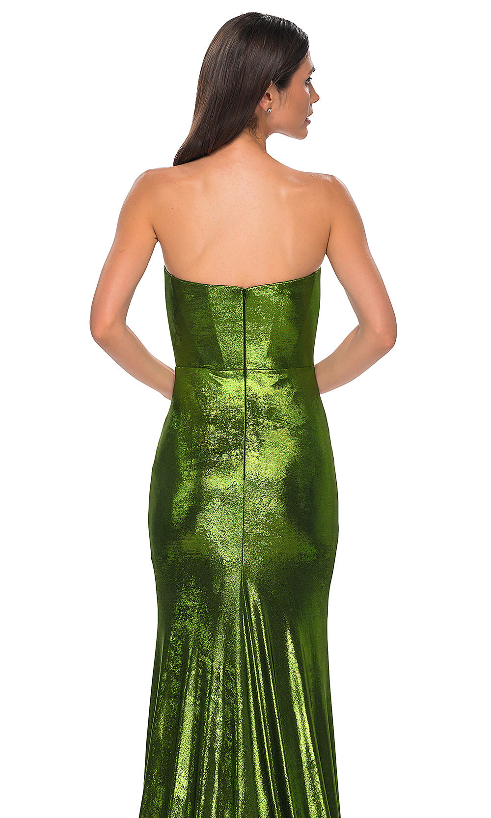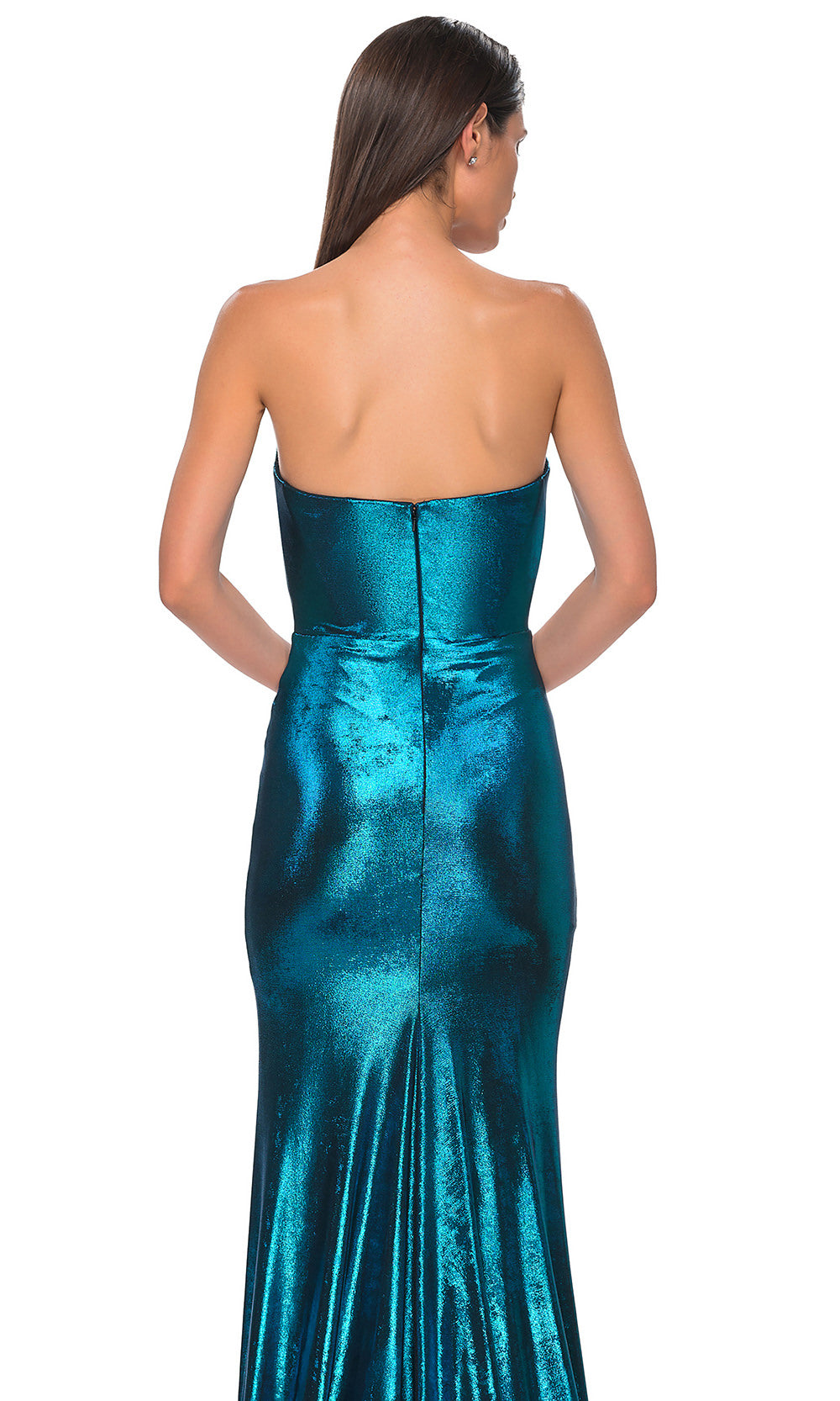 Create a stunning impression with the La Femme 32828 gown, a fabulous and versatile dress perfect for any formal event. This strapless brushed metallic dress features a fitted bodice with intricate seams and a sophisticated draped neckline, creating an elegant and modern look. The floor-length skirt parades in a sheath silhouette, accented with a high slit and finishing with a graceful train. The back zipper closure ensures a secure fit, providing both comfort and style. La Femme 32828 ensures you shine brightly. Models are wearing Purple, Mocha, Matcha, Indigo, Dark Teal, and Bronze colors.