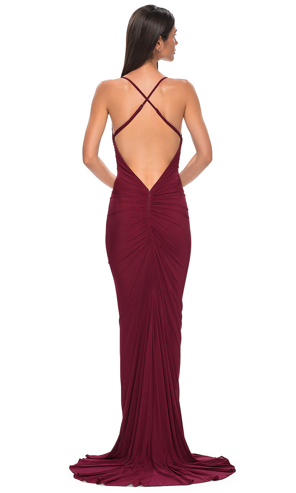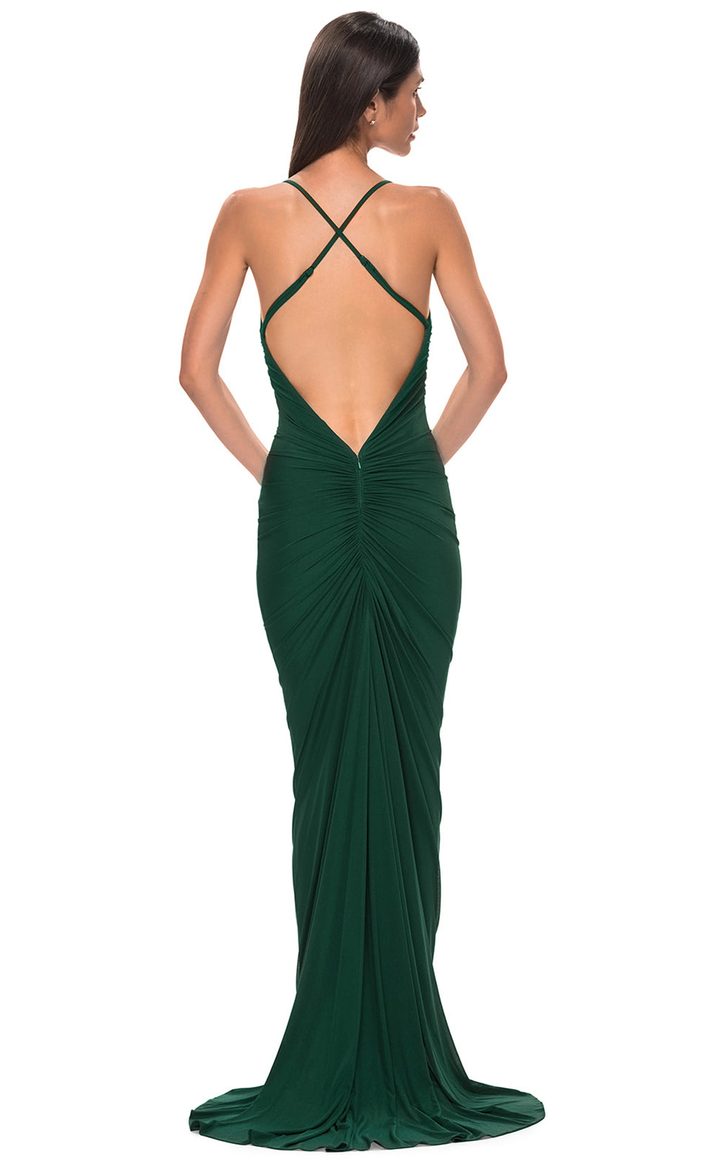 Draw attention with the La Femme 32834 dress, a luxurious net jersey gown designed to captivate at any formal event. This stunning dress features ruching throughout the gown, creating a sophisticated and flattering silhouette. The sleeveless fitted bodice is complemented by a V-neckline and adjustable straps that crisscross at the back, ensuring a perfect fit. The back showcases a chic low cut and ruching along the entire skirt, adding a touch of allure. The floor-length skirt parades in a sheath silhouette and ends with a graceful train. The back zipper closure provides ease and security. Ideal for prom, black-tie events, or any special occasion, this La Femme 32834 combines timeless beauty with modern sophistication. Models are wearing Emerald, Dark Berry, Black, and Royal Blue colors.