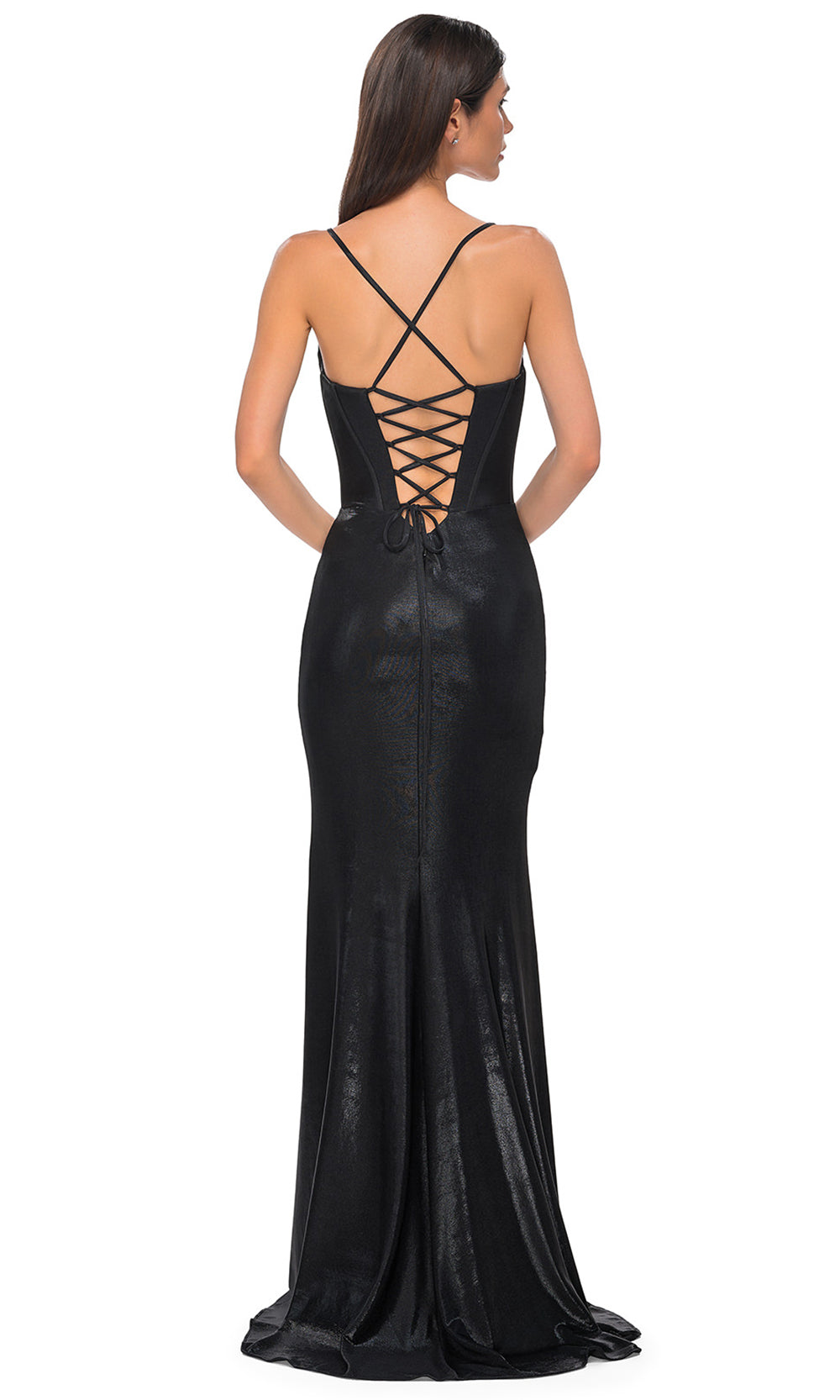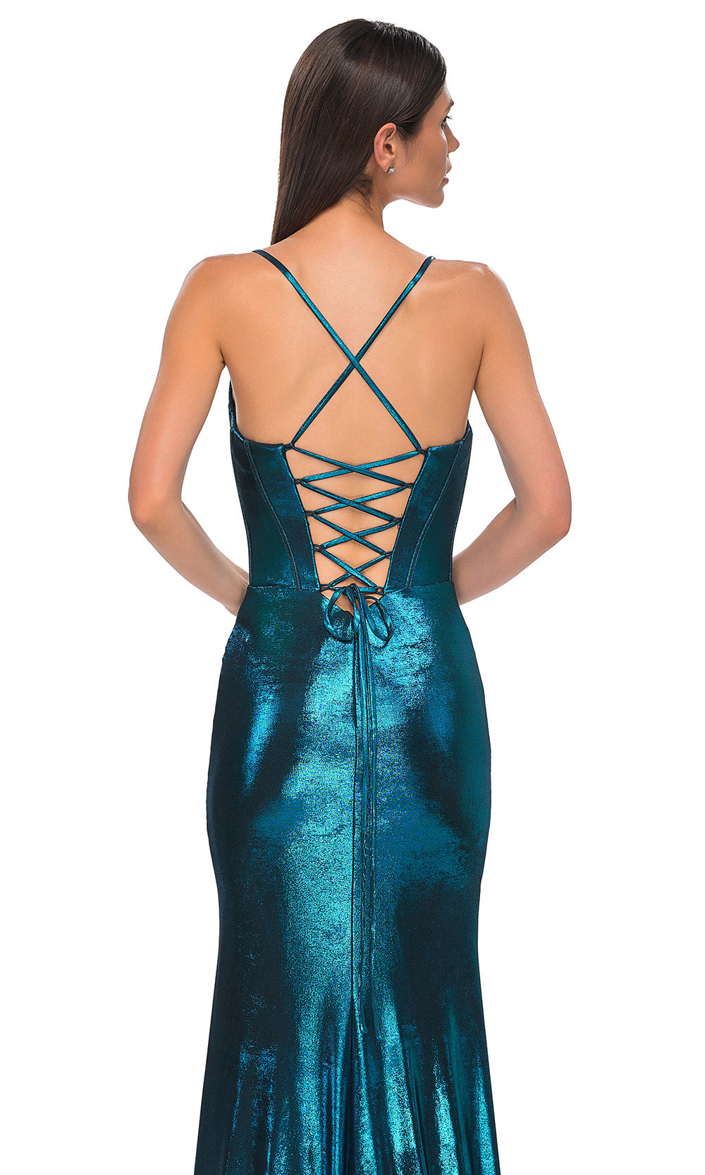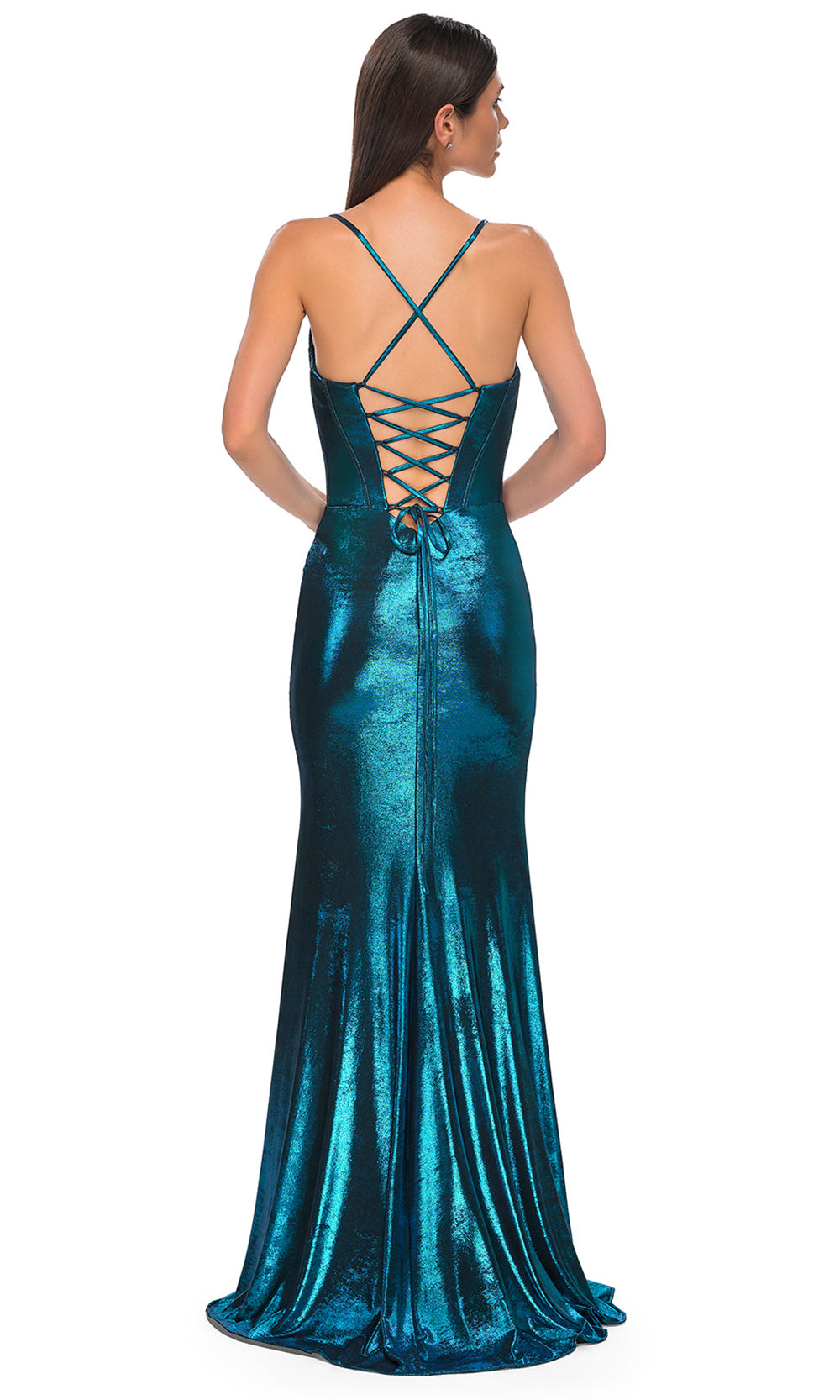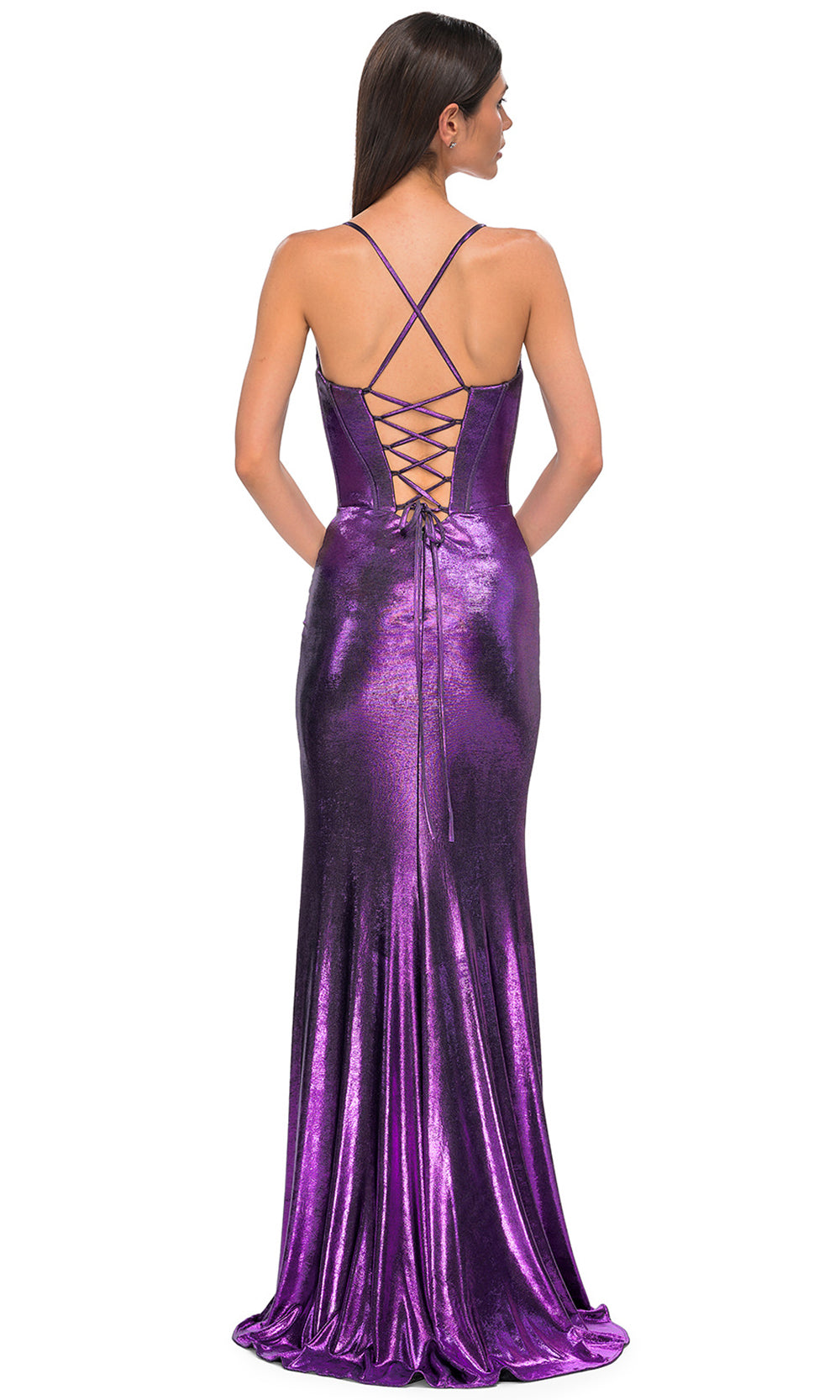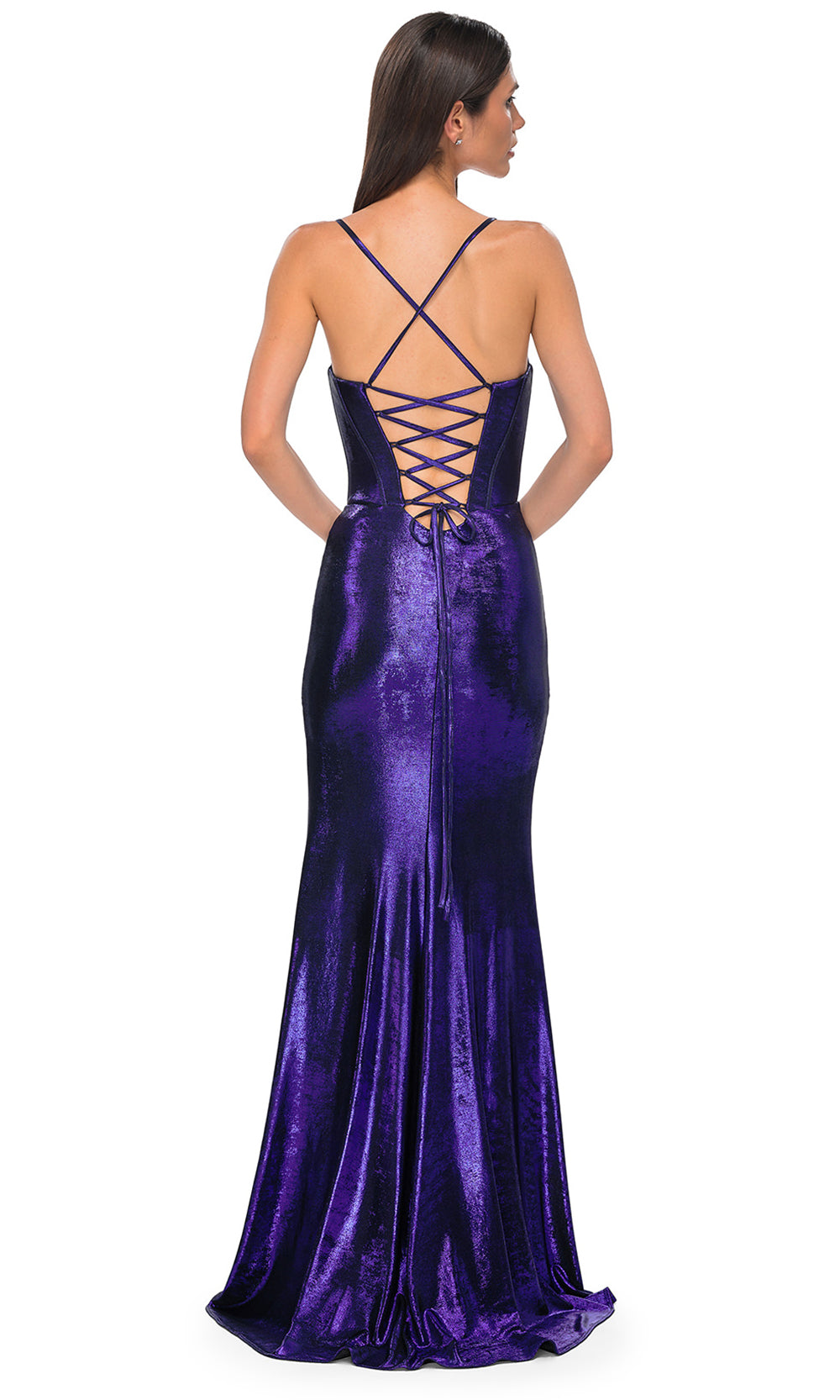 Capture that striking presence with this La Femme 32877 dress, a chic brushed metallic jersey gown designed to captivate at any formal event. This stunning long dress features a sleeveless corset-style top with exposed boning, creating a structured and elegant silhouette. The adjustable lace-up ties in the back ensure a perfect and secure fit, while the back zipper closure provides ease and comfort. The floor-length skirt is accented with a high slit, adding a touch of allure, and ends with a graceful train. Ideal for prom, black-tie events, or any special occasion, this La Femme 32877 combines timeless beauty with modern style, ensuring you shine brightly and leave a lasting impression. Models are wearing Penny, Lavender, Indigo, Dark Teal, and Mocha colors.