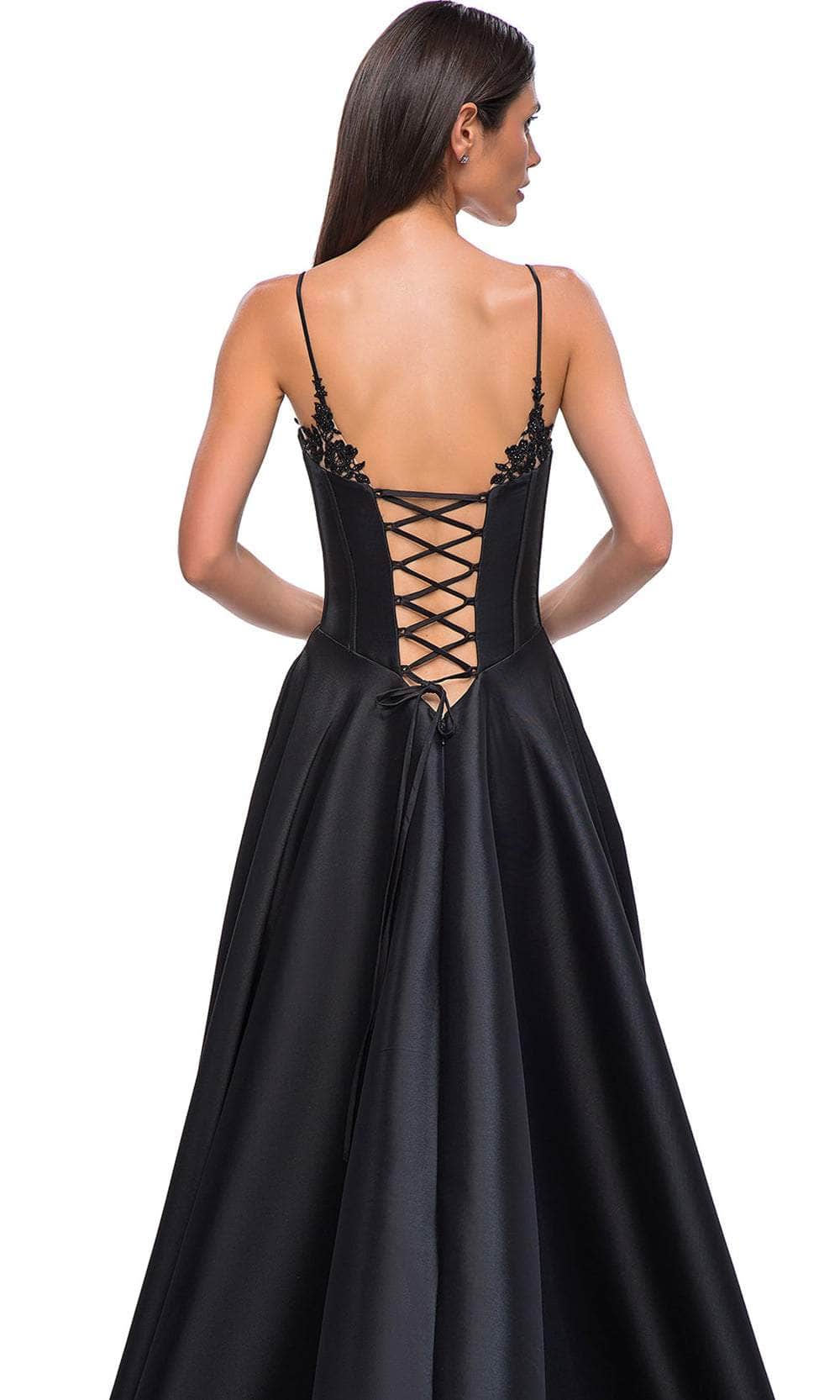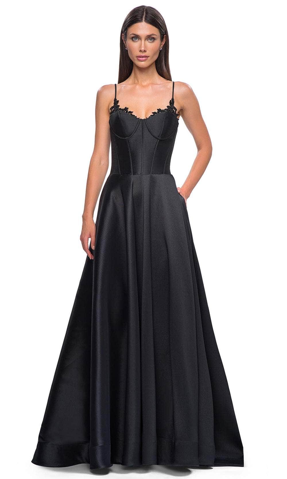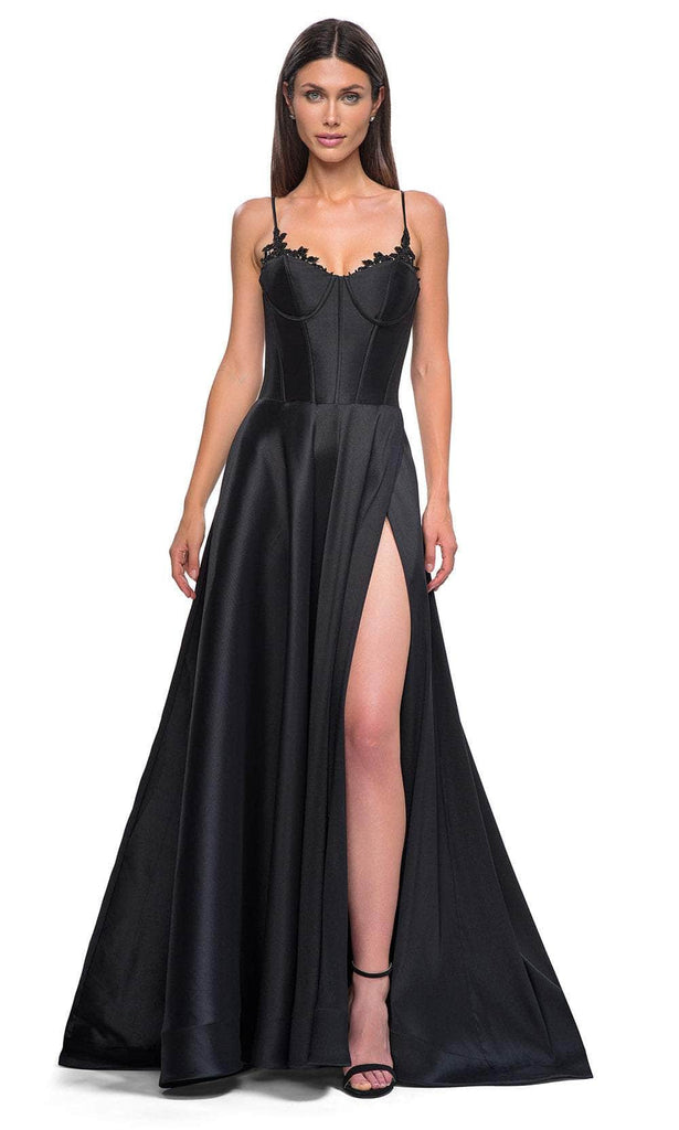 Make a lasting impression with the La Femme 32878 gown, an exquisite A-line Mikado evening dress that exudes elegance and charm. The corset-style top features exposed boning and a sweetheart neckline with delicate lace appliqué peeking out from the bust, creating a sophisticated and alluring look. The lace-up adjustable back straps ensure a perfect fit, while the back zipper closure offers convenience. The floor-length skirt is beautifully accented with a high leg slit and ends with a train, adding a touch of drama and grace to the silhouette. To ensure you shine brightly and leave a lasting impression wear this La Femme 32878. Model is wearing Black color.