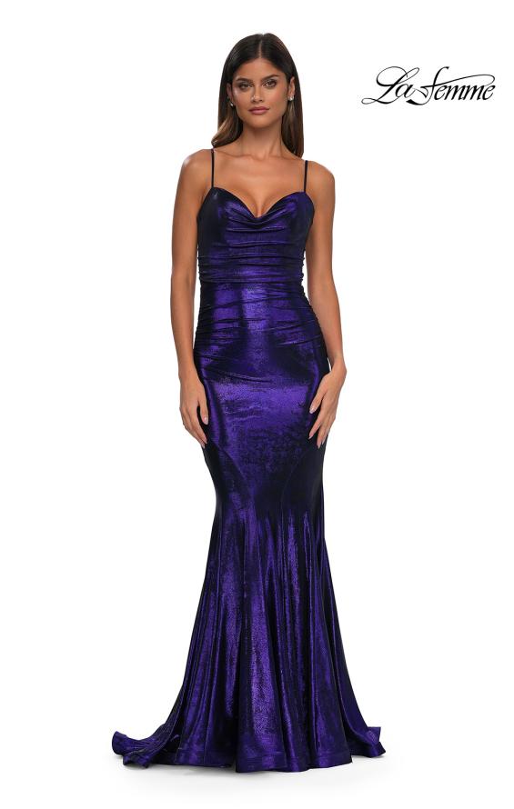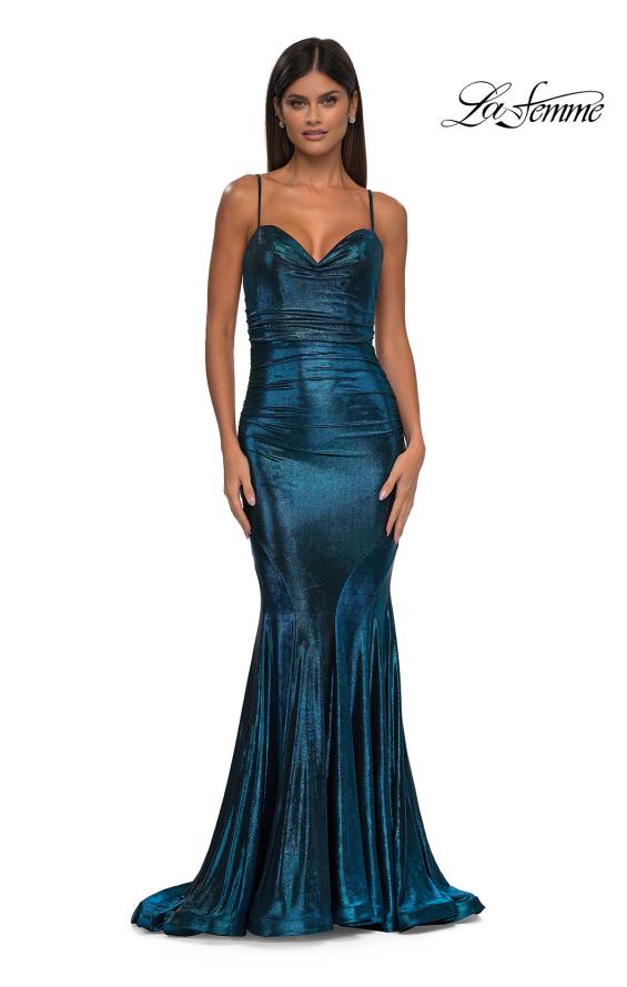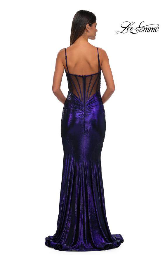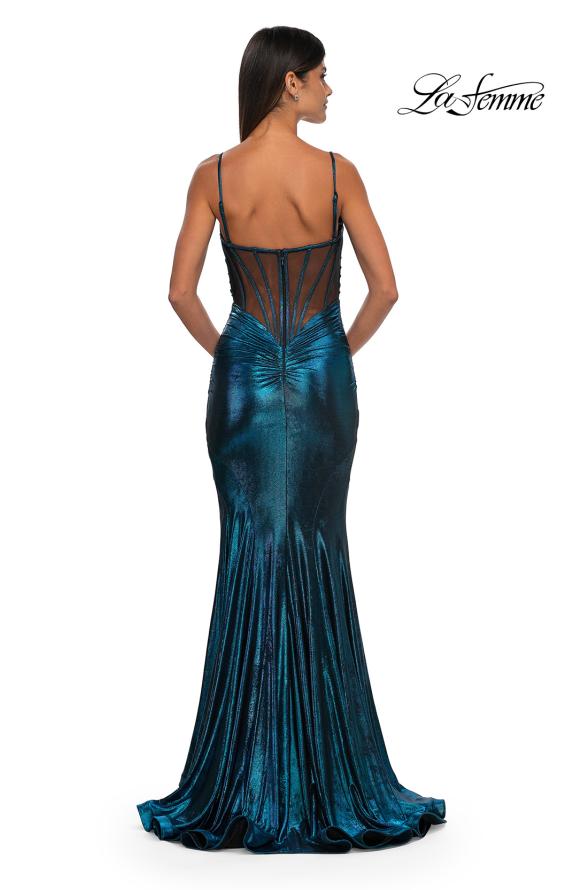Give yourself the appearance and confidence you deserve with the La Femme 32897 prom dress, an elegant long gown designed to captivate. This stunning dress is crafted from brushed metallic jersey fabric and features a dramatic mermaid-style skirt that beautifully ends with a train, creating a striking silhouette. The sweetheart neckline of the sleeveless fitted bodice is elegantly draped, adding a touch of romantic allure. The back showcases illusion mesh and exposed boning, providing a modern and captivating element. The back zipper closure ensures a secure and comfortable fit. La Femme 32897 ensures you shine brightly and leave a lasting impression. Models are wearing Black and Bronze colors.