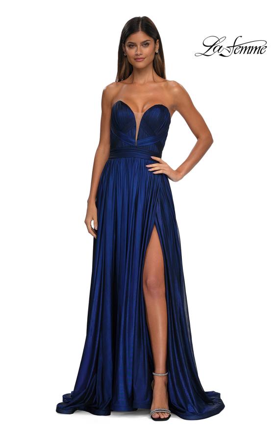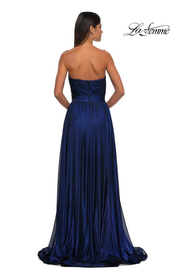 Indulge your glamorous side and captivate in this La Femme 32899 masterpiece. The gown is made from luxurious metallic net jersey that drapes beautifully with ruched detail throughout for an everlasting charm. A strapless design is topped by the enticing plunging sweetheart neckline and open back. A structured wide waistband enhances and slims your waistline. The A-line skirt flows gracefully to the full-length hem, finished off with a high slit for a sultry leg reveal. Stay effortlessly stylish and comfortable in the La Femme 32899 gown. Models are wearing Black Gold, and Purple colors.