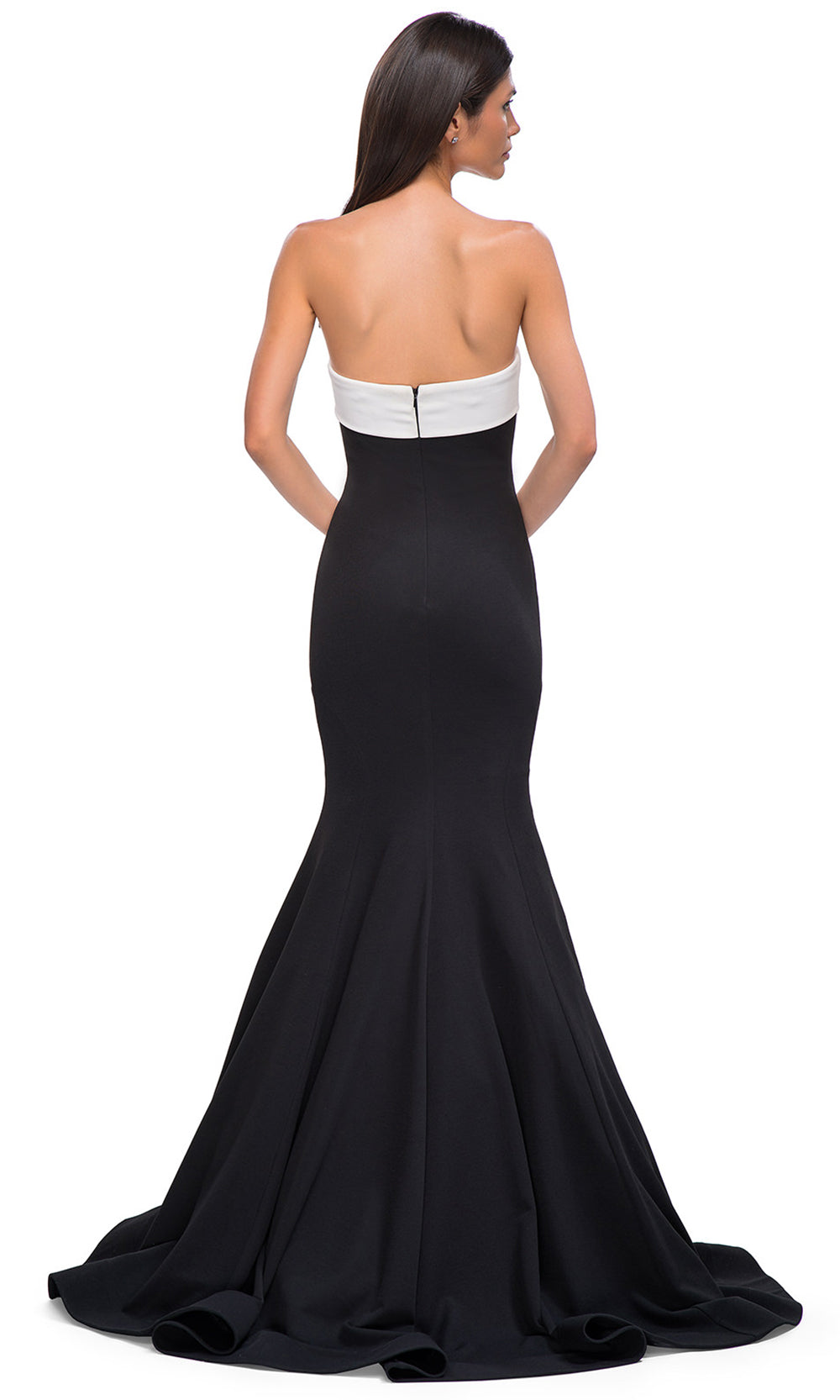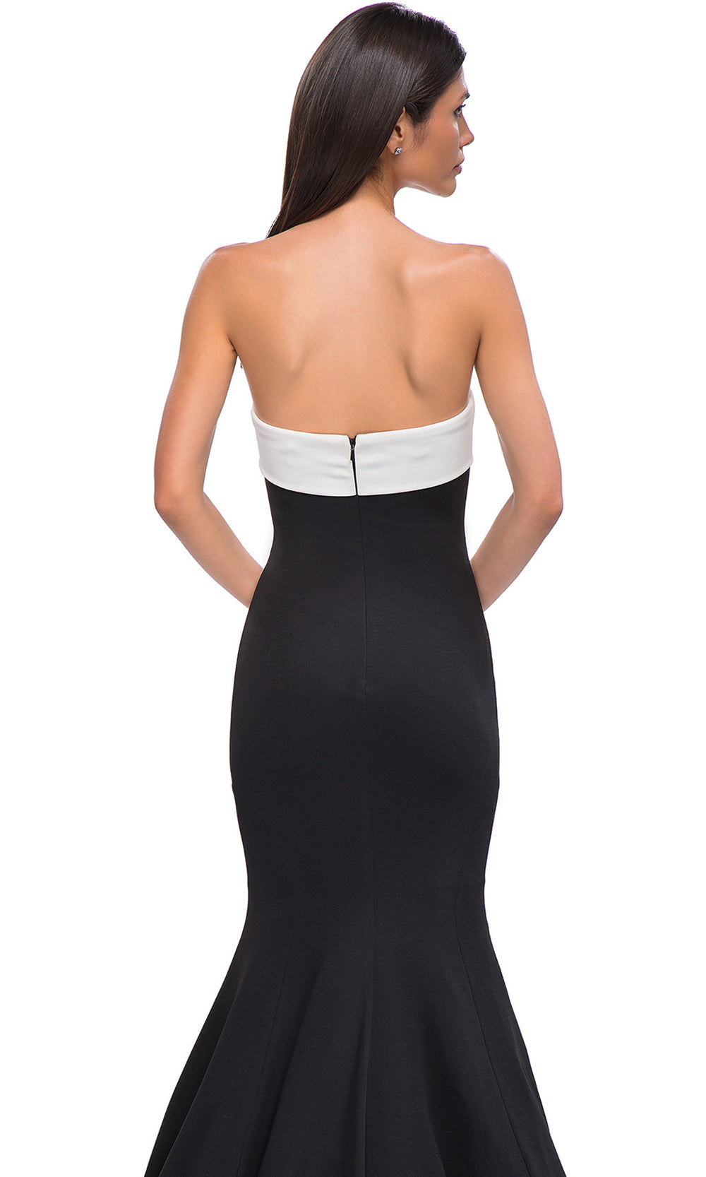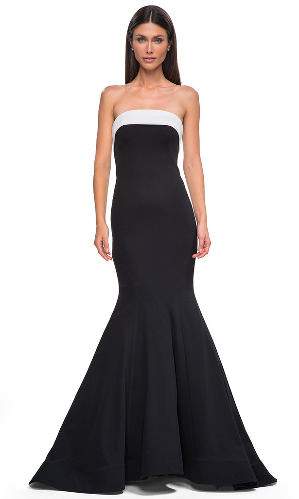 Turn heads in the sophisticated La Femme 32914 evening gown. This mermaid-style dress boasts a chic black and white design that exudes elegance. The neckline is accentuated with a white trim that gracefully wraps around to the back, creating a striking contrast. The figure-hugging silhouette flares out at the bottom, enhancing your curves and adding a dramatic flair. Finished with a back zipper closure for a secure fit, this floor-length gown is perfect for any formal occasion. The La Femme 32914 dress combines timeless design with modern sophistication, making it an exquisite choice for your special night. Model is wearing Black color.