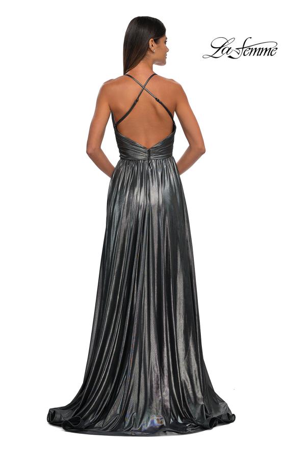Bring out your inner charm and royalty on prom night with this La Femme 32917 masterpiece. The metallic jersey gown features a sleeveless design enhanced by ruching and a wrapped wide waistband to beautifully flatter your figure. Its plunging v-neckline and backless style with supportive crisscross strap design creates a look that is both daring and elegant. With its wrap design, the skirt makes an A-line silhouette that glides into a sweep train. Complete with hidden pockets for functionality and a thigh-high leg slit. Be memorable in this La Femme 32917 long gown. Model is wearing Indigo color.