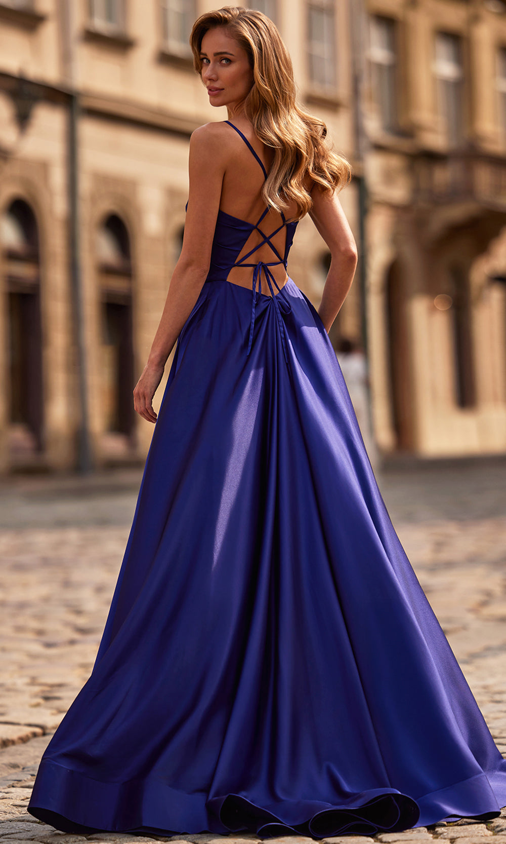 | Details: | Spaghetti Straps, Ruched Bodice, High Slit, Side Pockets, Flowing Skirt, Open Lace-Up Back |