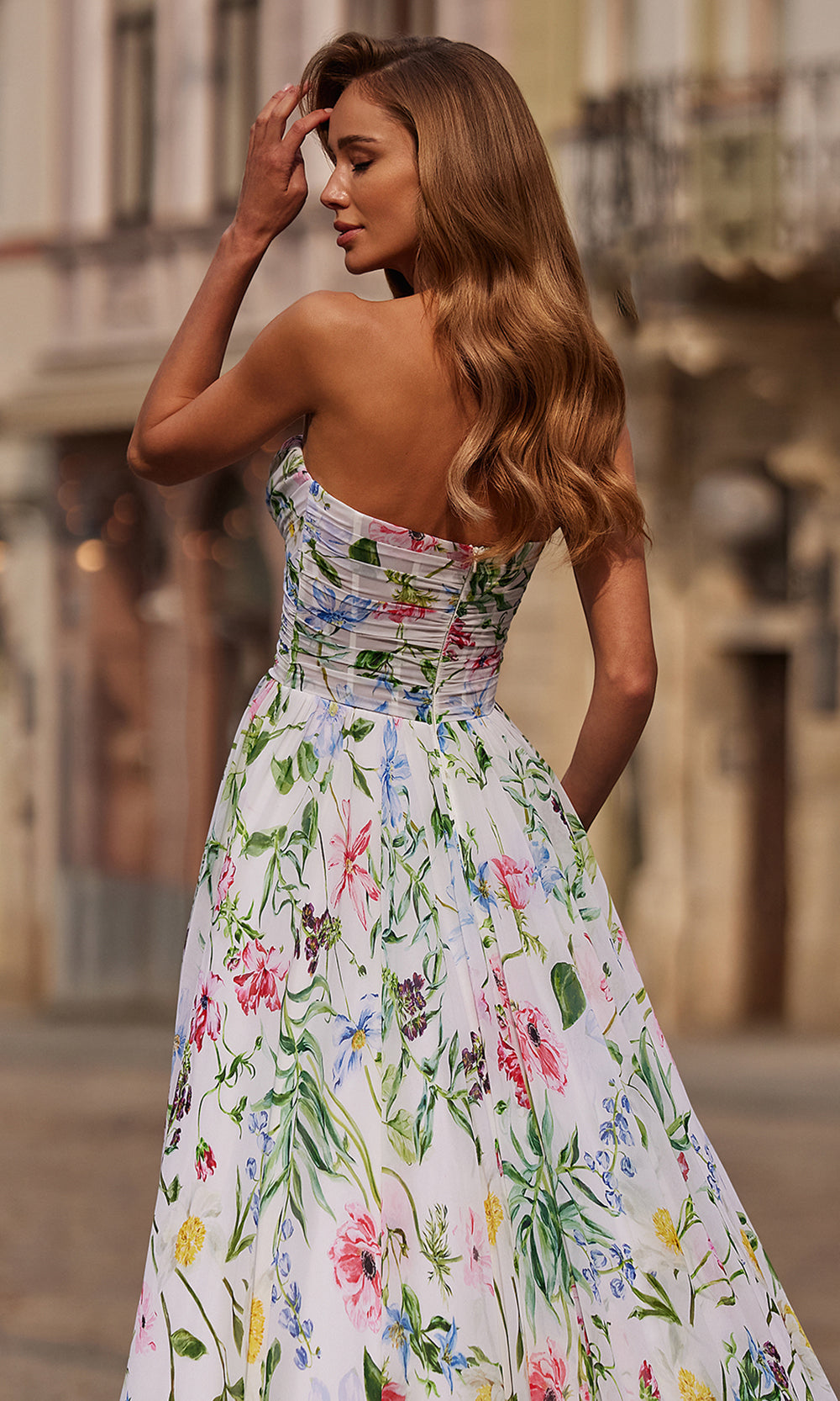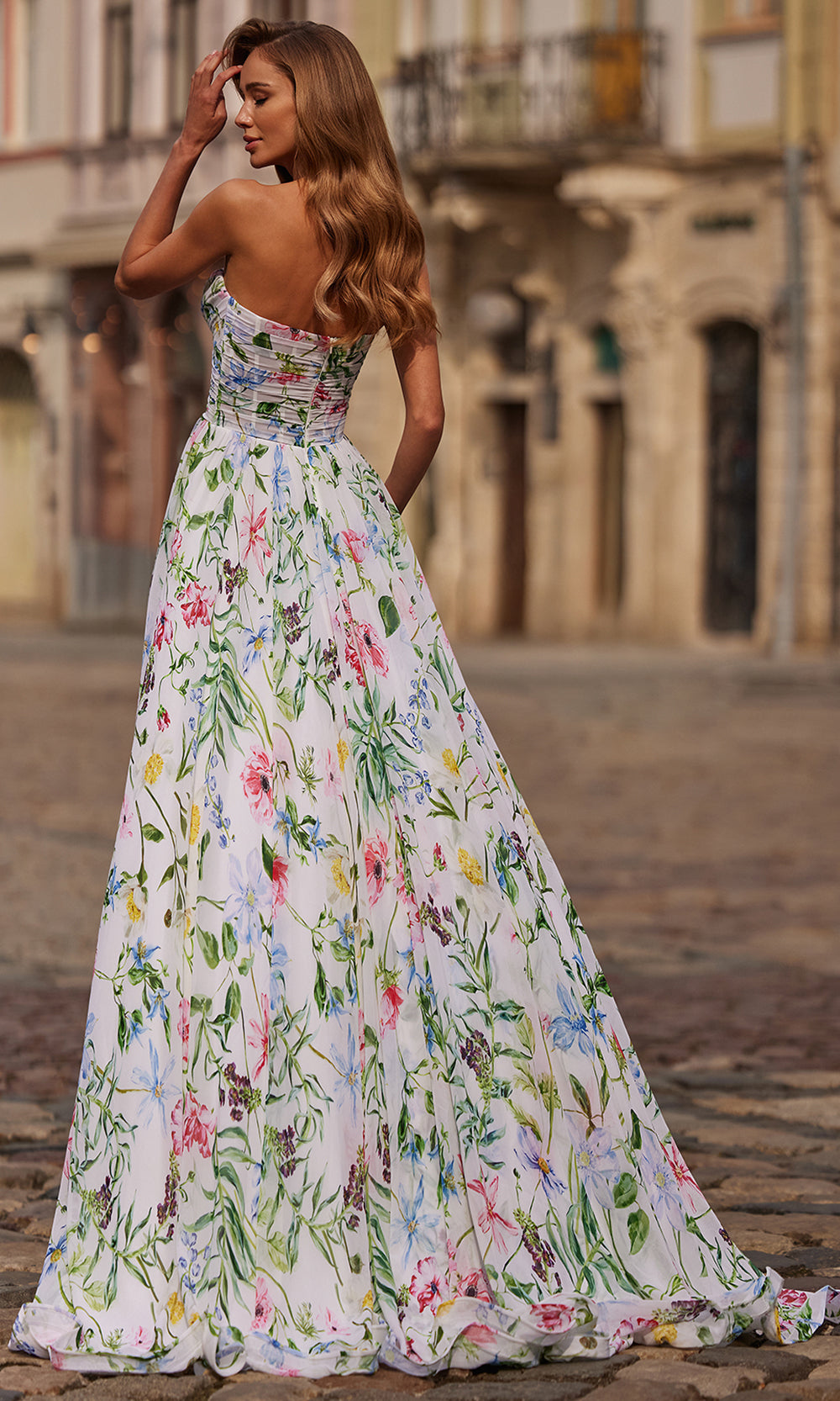 | Details: | Ruched Detailing, Strapless, Thigh-High Slit, Sweep Train, Floral Print, Mid-Open Back |