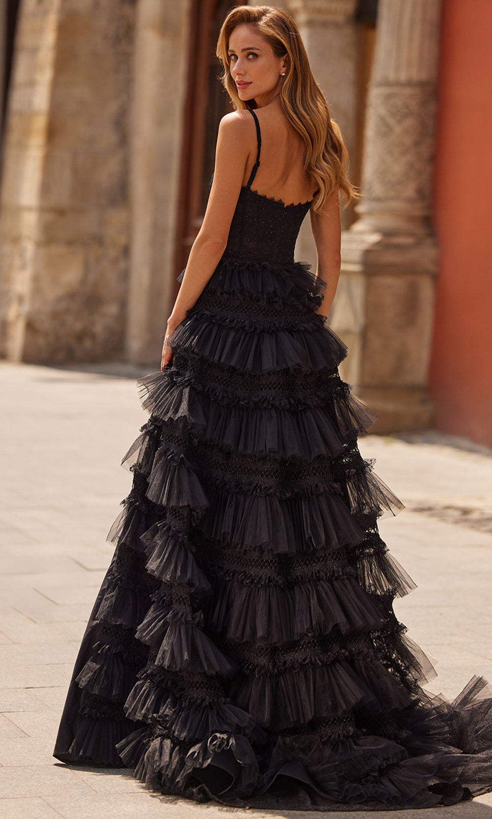 A captivating mix of drama and sophistication defines La Femme 33493, a gown that transforms classic eveningwear into a modern statement. The sculpted scoop neckline leads into a corset bodice adorned with detailed beaded lace, creating a striking upper profile. A daring high slit introduces movement, balancing its tiered ruffle A-line skirt with a refined edge. Perfect for gala nights or upscale celebrations, La Femme 33493 embodies theatrical grace and undeniable presence with every step. Model is wearing Black color.
