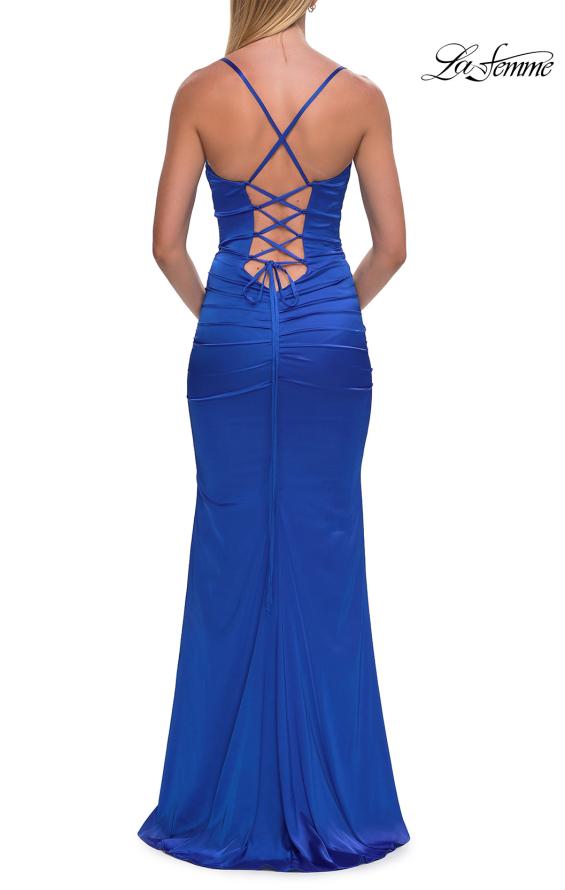 A balance of grace and sophistication defines La Femme 33611, ideal for those seeking understated yet striking style. The deep V-neckline pairs with slender straps to frame the shoulders, while soft ruching accentuates the waist for a contoured effect. Its sheath silhouette subtly flares at the hem, creating fluidity and charm without excess. From evening galas to milestone celebrations, La Femme 33611 exudes quiet confidence and timeless elegance with every movement. Model is wearing Dark Teal color.