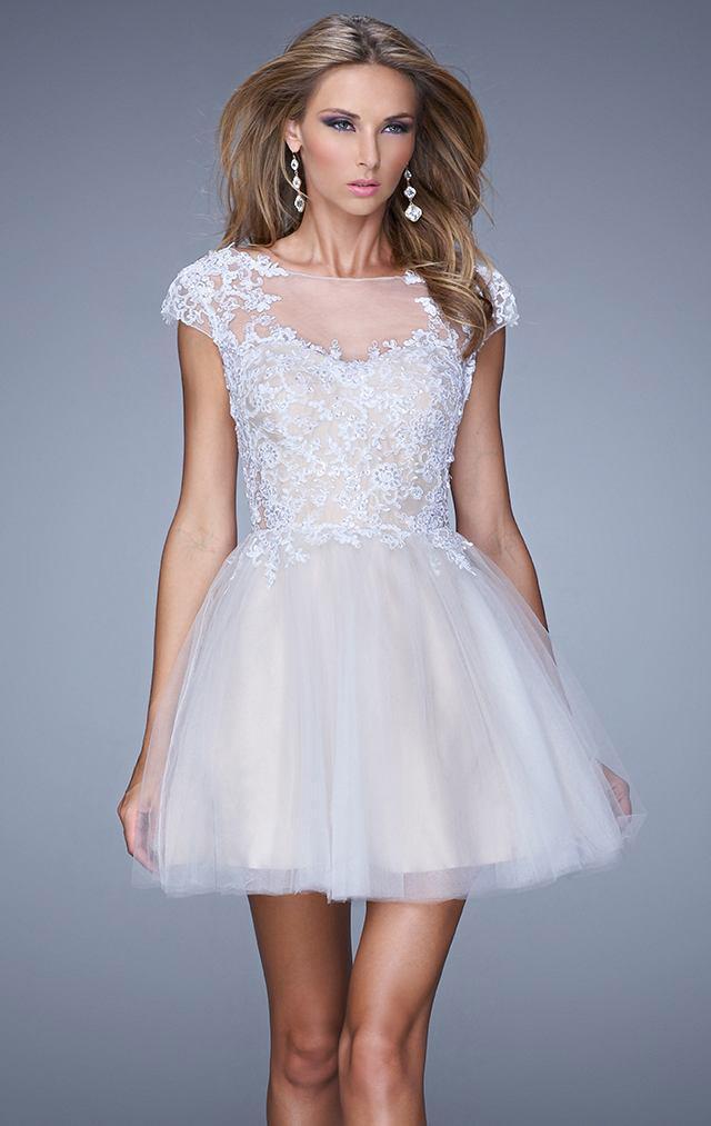A lovely tulle dress with an illusion bateau neckline paired with cap sleeves. The neckline and back are sheer, embellished with lace appliques. This dress ends with a back zipper closure. Model is wearing the White colors.