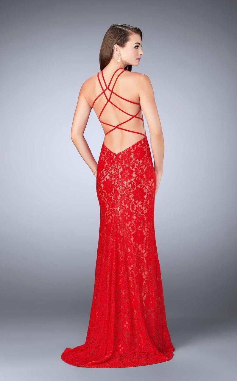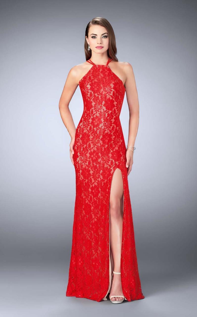 Exude classic feminine guile in this stunning lace creation by La Femme 24293. This fascinating lace dress showcases a high halter neckline and a sultry side slit. It also features a strappy back and back zipper closure. Relish the use of your femininity when donned with this riveting creation by La Femme.