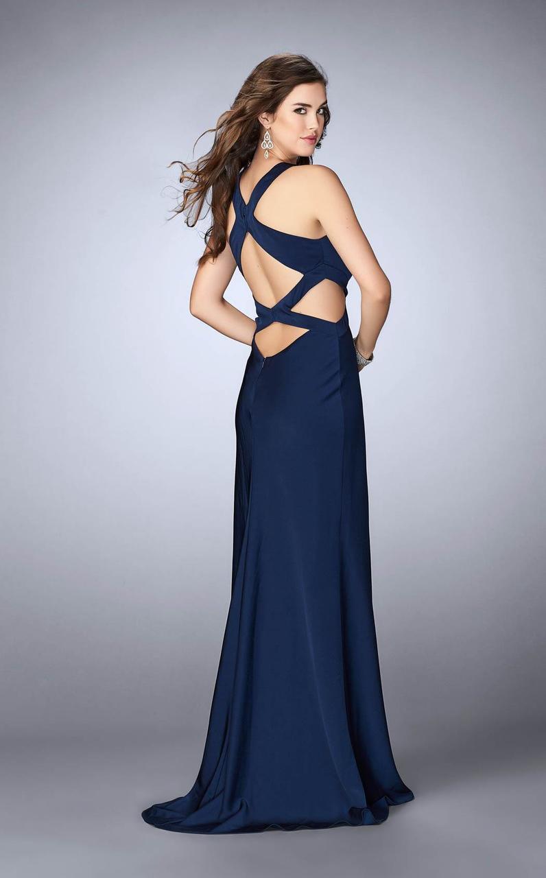 Expect to be turning heads as you walk into your special event wearing this creatively romantic gown by La Femme 24369. Graceful jersey gown with a criss cross neckline and center keyhole. The dress is finished with a front slit and dramatic open back. Back zipper closure. Turn yourself into a timeless gorgeous deity in this creation by La Femme.