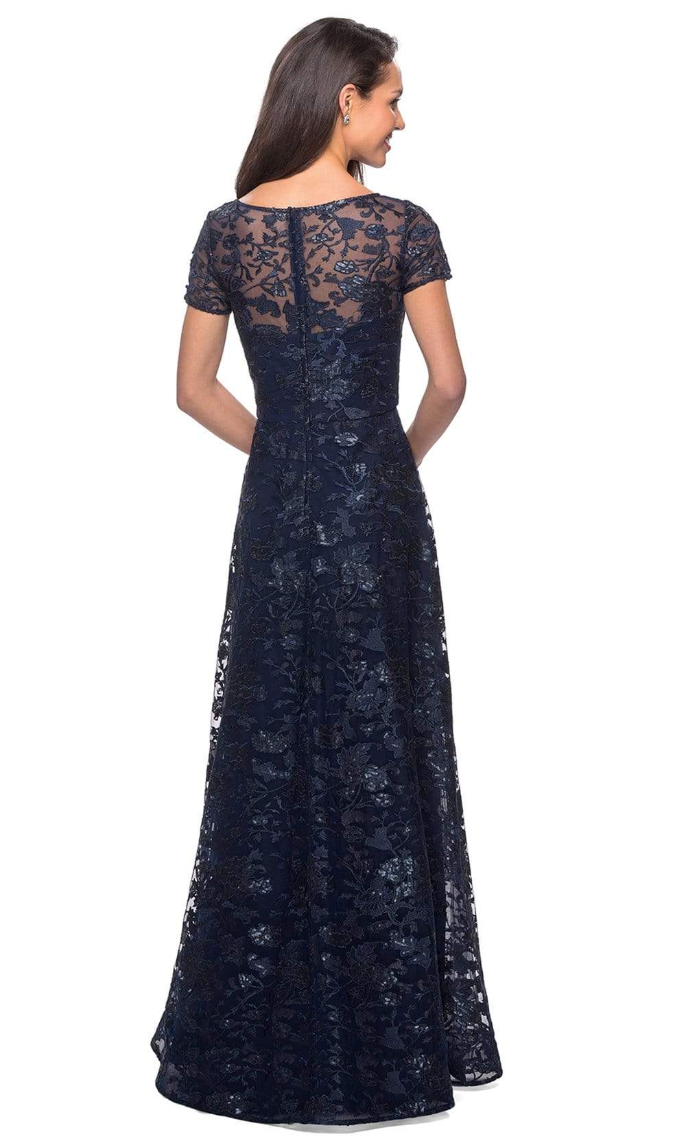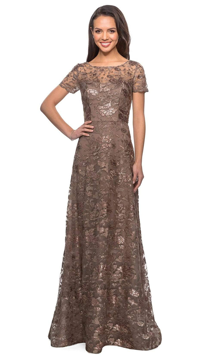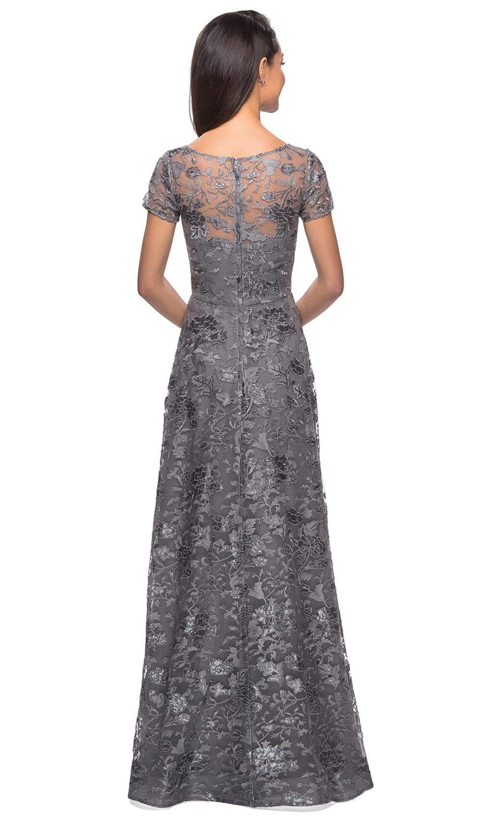 Gorgeously embroidered with lovely blossoms, this piece features an illusion bateau neckline paired with a sweetheart lining. Designed with sheer short sleeves and an illusion full back, the exquisite sequined floral motif softly flares down into a full-length hemline.