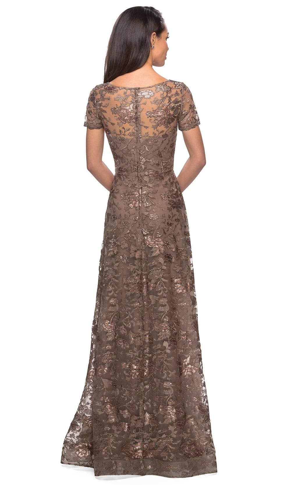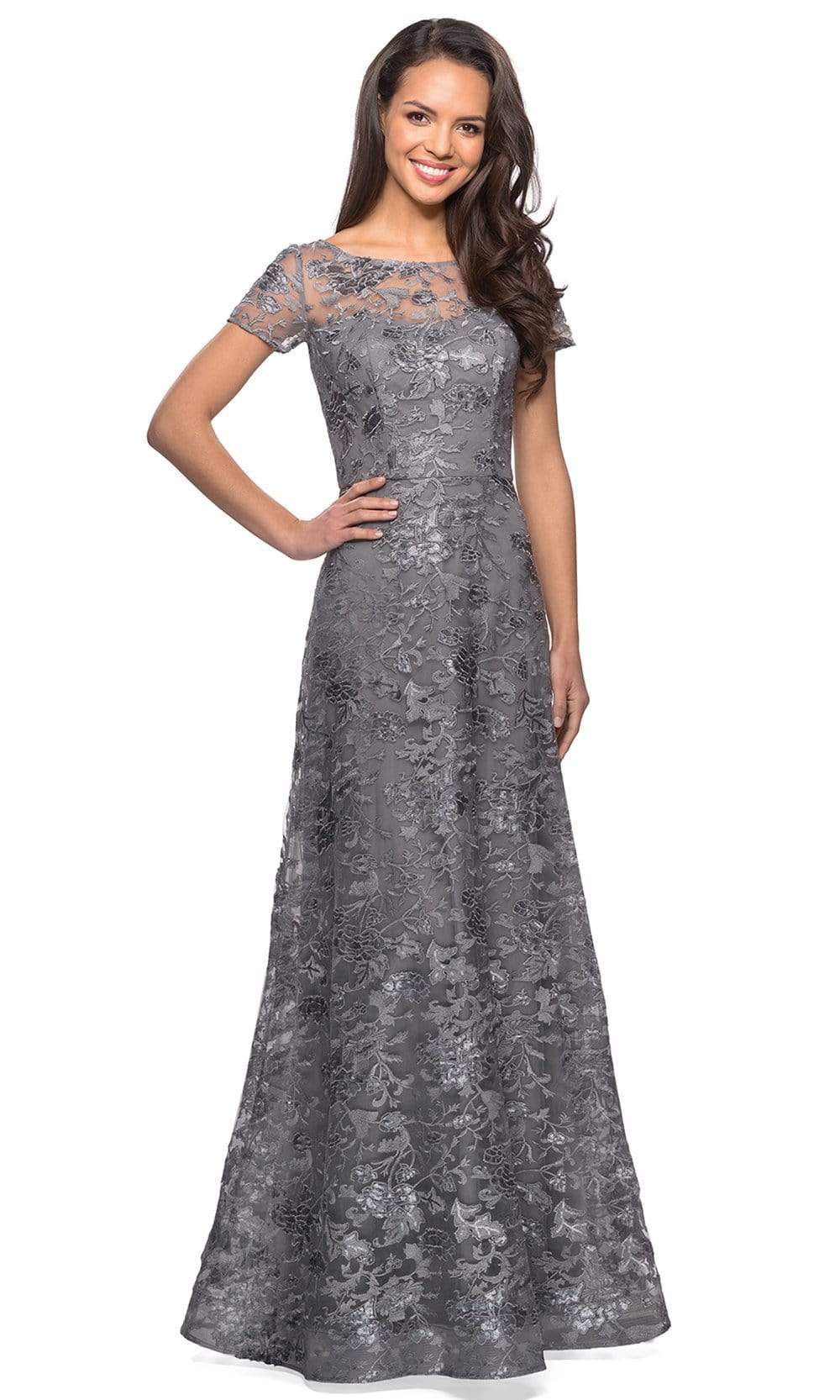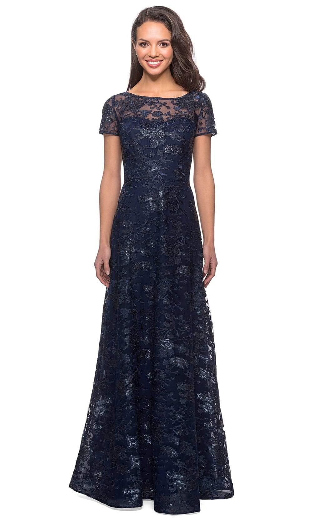 Gorgeously embroidered with lovely blossoms, this piece features an illusion bateau neckline paired with a sweetheart lining. Designed with sheer short sleeves and an illusion full back, the exquisite sequined floral motif softly flares down into a full-length hemline.