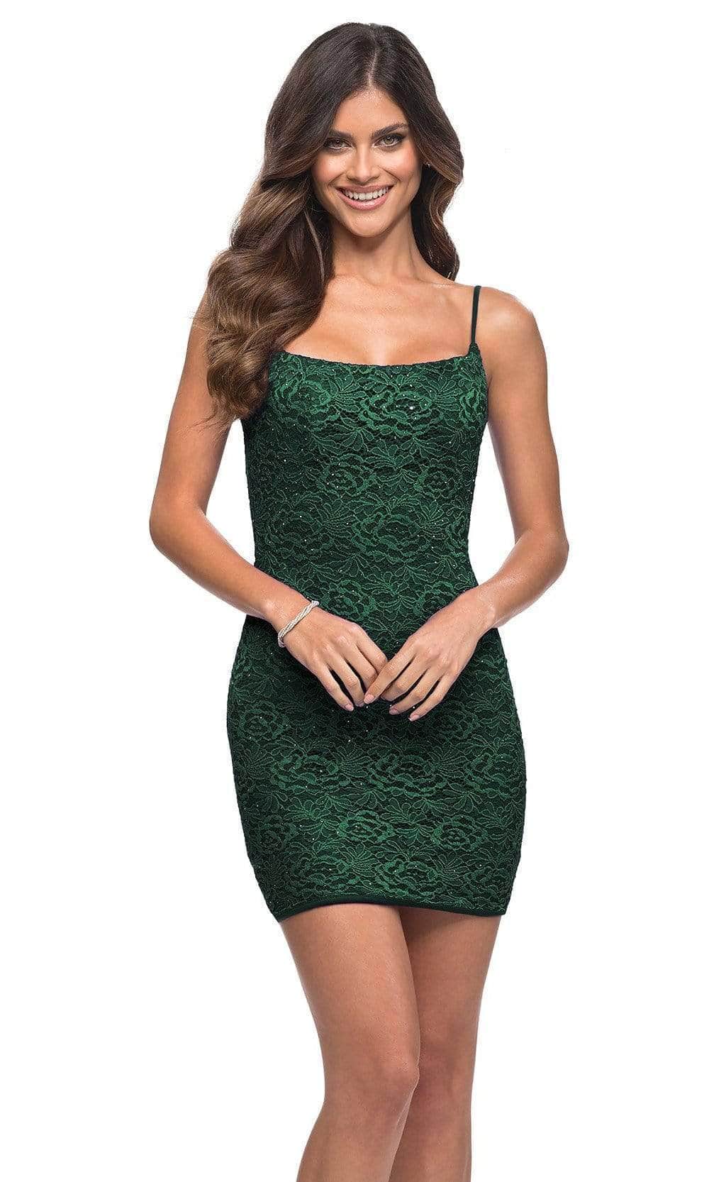 Charm everyone with the fantastic flair of this stunning La Femme 30265SC creation. Festooned with rhinestones on a floral lace silhouette, this piece shows a straight-across neckline. Defined with spaghetti straps converging into an open V back, the skirt skims to end in a short hemline. Envelope yourself in a sophistication like no other in this La Femme masterpiece. Models are wearing the Emerald and Royal colors.