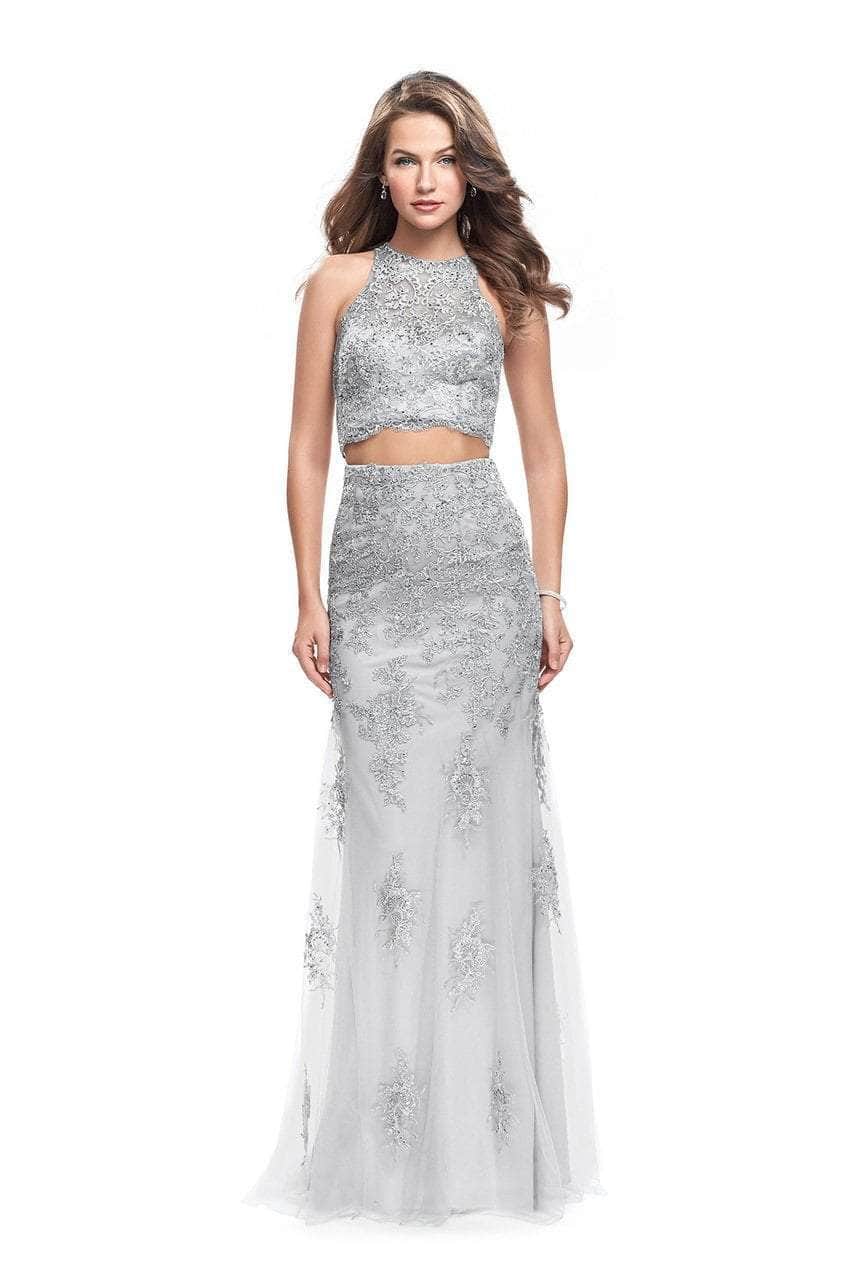 With a dash of glitz, elevate the conventional style in this chic two-piece beaded lace evening gown by La Femme Gigi 26294. The crop top with no sleeves has a high halter neckline with scalloped edging that exposes the stomach. The sheath skirt's elaborate beaded lace glides elegantly to the full-length hem. Glimmer and sparkle as you traverse the evening in this captivating evening ensemble from La Femme Gigi 26294. Model is wearing a Silver color.