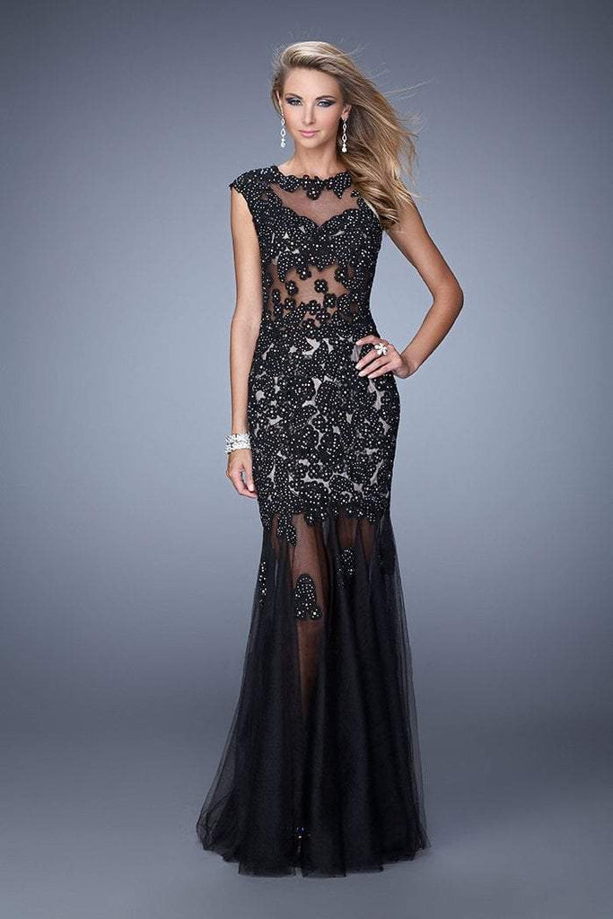 This dress from shows a sheer neckline, midriff and tulle skirt. The dress flaunts rhinestones and embroidered lace appliques. The back is open with the sheer cap sleeves connecting at the neck. Back zipper closure.
