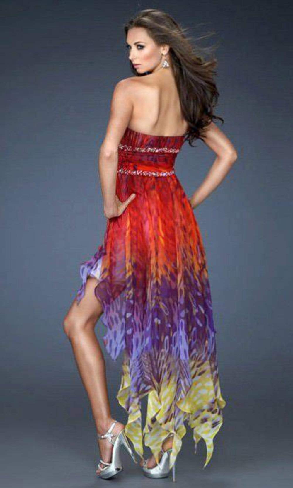 Feel sexy in this stunning high-low print dress by La Femme 18051. Gorgeous colors complement one another to make this one of a kind print in one of La Femme's hottest styles. The look you love is now available in a fiery combination that will make you unforgettable on your big night. The fitted Ruched bodice features an empire waist and intricate detail that cinches the natural waist to accent your best curves. The paneled chiffon skirt cascades in soft layers to add a feminine touch to this super sexy style. Perfect for homecoming, cocktail events and prom. This La Femme style will make a statement they will never forget!