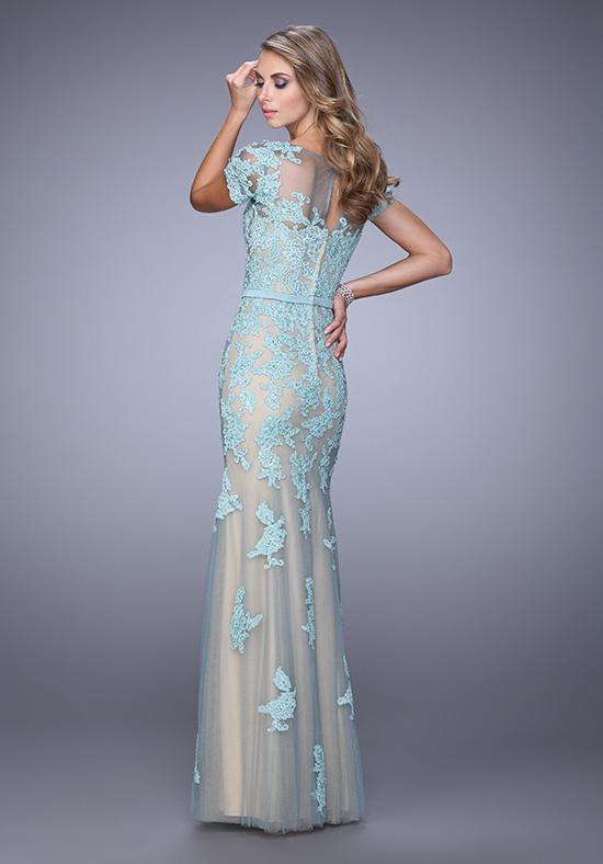 | Details: | Sheer fabric, Short sleeves, Lace appliques, Ribbon belt, Back keyhole, Back zipper, Sheath skirt, Nude lining |