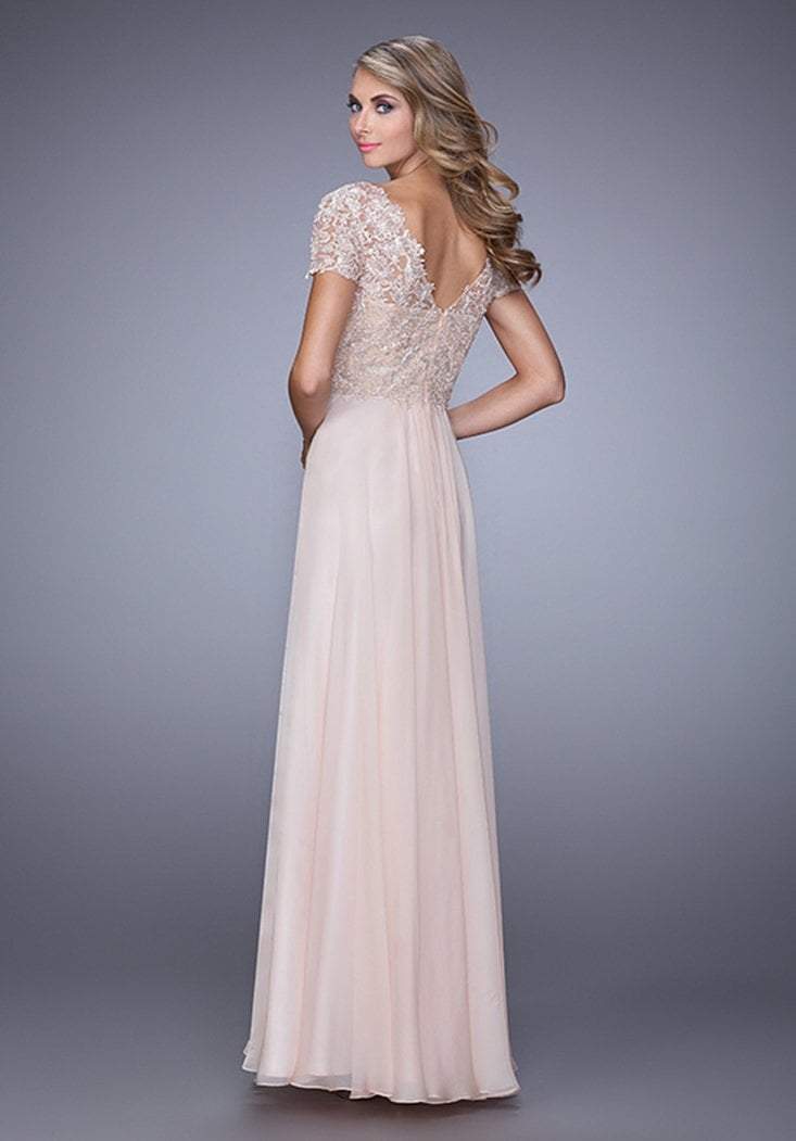 This chiffon gownåÊgraces a v-neckline in front and back. This dress has short sleeves and richly textured lace overlay at the bodice. The gathered skirt falls down the ground that balances the look with an edge.