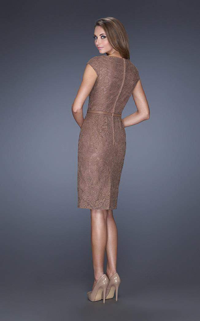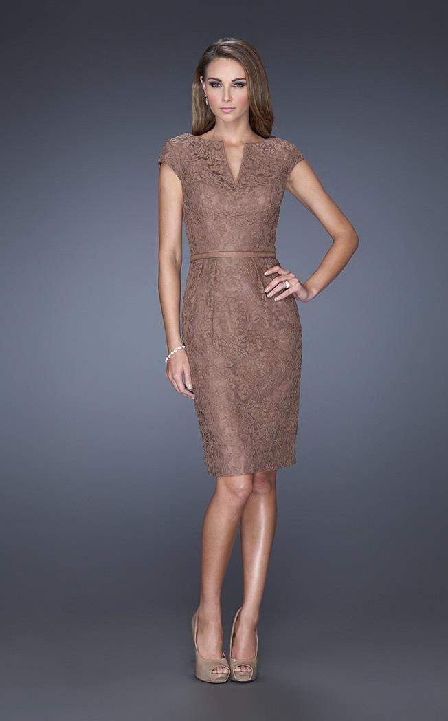 Modern lace dress with small pleats accentuate the waistline and a structured V neckline. The natural waistline is accented with a thin belt. Back zipper closure.