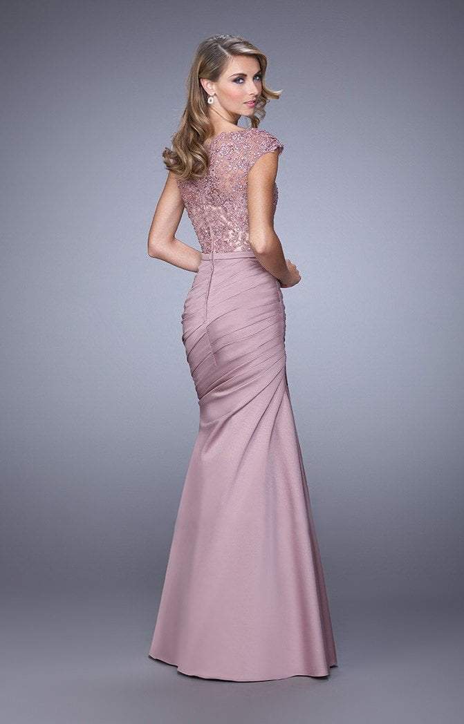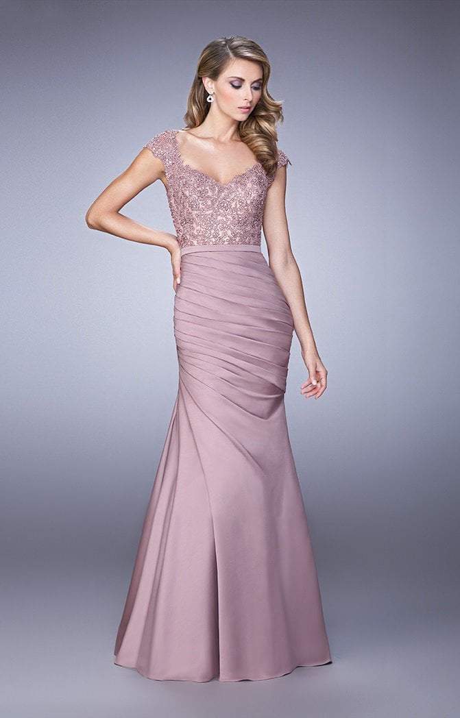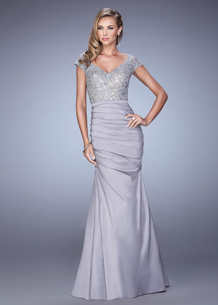 | Details: | Cap sleeves, Lace top, Satin skirt, Asymmetric pleats, Back zipper closure, Floor length |