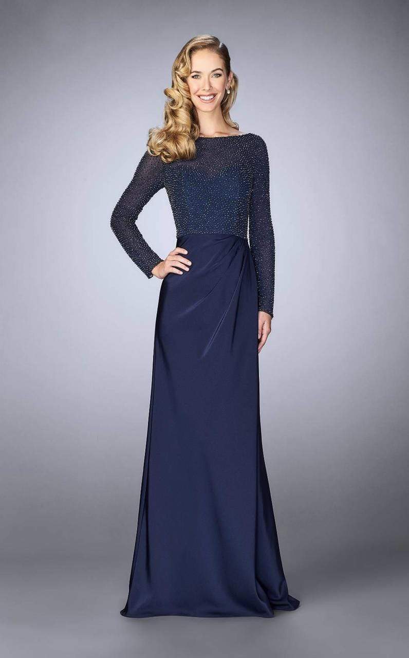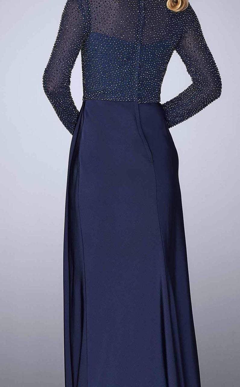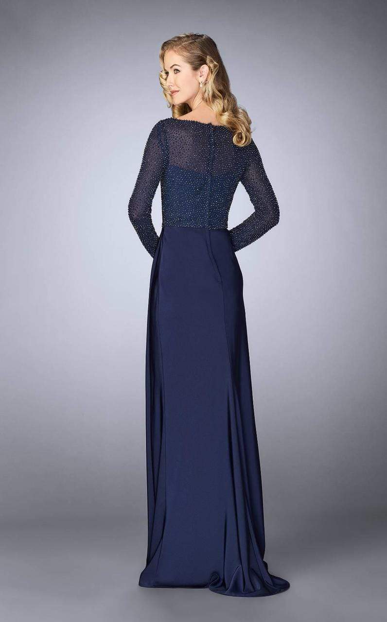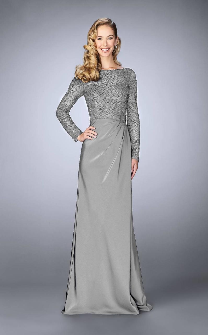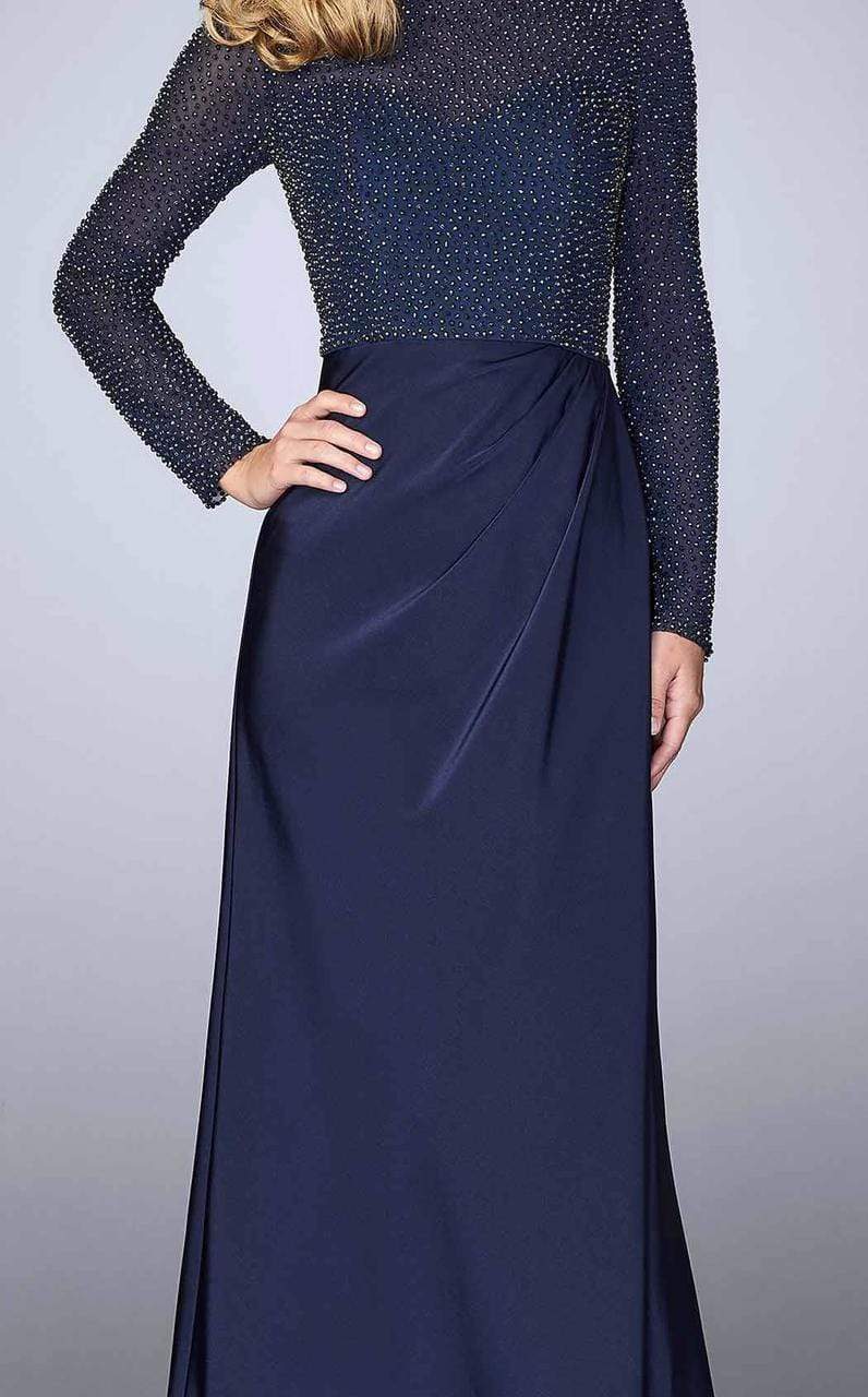This jersey gown features a sheer bateau neckline with long sleeves. The bodice is designed with beadwork. Ruched accent gathers at one side of the skirt and cascades to a slight sheath silhouette. This gown cascades to a floor length. The back has center zipper closure.