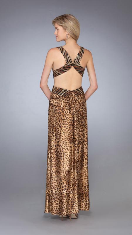 Dress to impress with this with this dress by La Femme 13266. Fresh animal printed V-neck gown with a vibrant beaded waist band and side cut outs. Criss-crossed straps with a touch of a diamond back. This dress by La Femme creates a fun and exciting look.