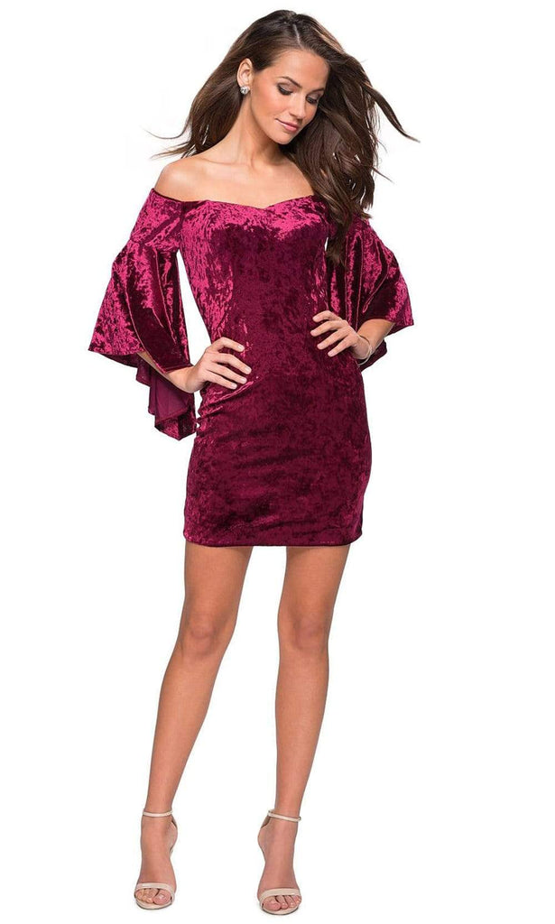 | Details: | Fitted, Off Shoulder Quarter Length Bell Sleeves, Mid-Thigh Length, Mid-Open Back, Back Zipper Closure |