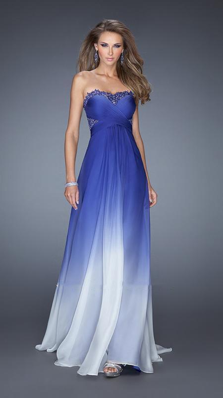 Make your presence known with this elegantly-rendered La Femme 20167 piece. Showcasing the most stunning display of vivid ombre effect on the soft fabric, this gorgeous darling flaunts a lace-trimmed sweetheart neckline, sheer side panels and an illusion Basque mid-open back. Graced with a spectacular crossover tucked detail on the bodice, soft pleating gathers at the waist as it flares down to a full-length hem and a billowing sweep train. Cease from sharing the spotlight with this stunningly vibrant masterstroke by La Femme.