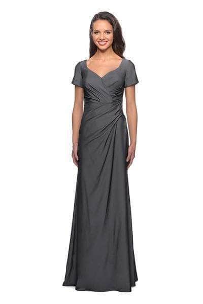 Defined with pleats accenting the faux surplice bodice, this delight shows a curving v-neckline framed with short sleeves. Designed with a full back and contrasting diagonal pleats radiating from the side, the A-line skirt traverse down into a full-length hemline.