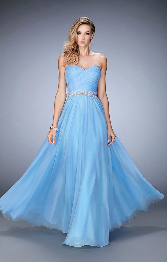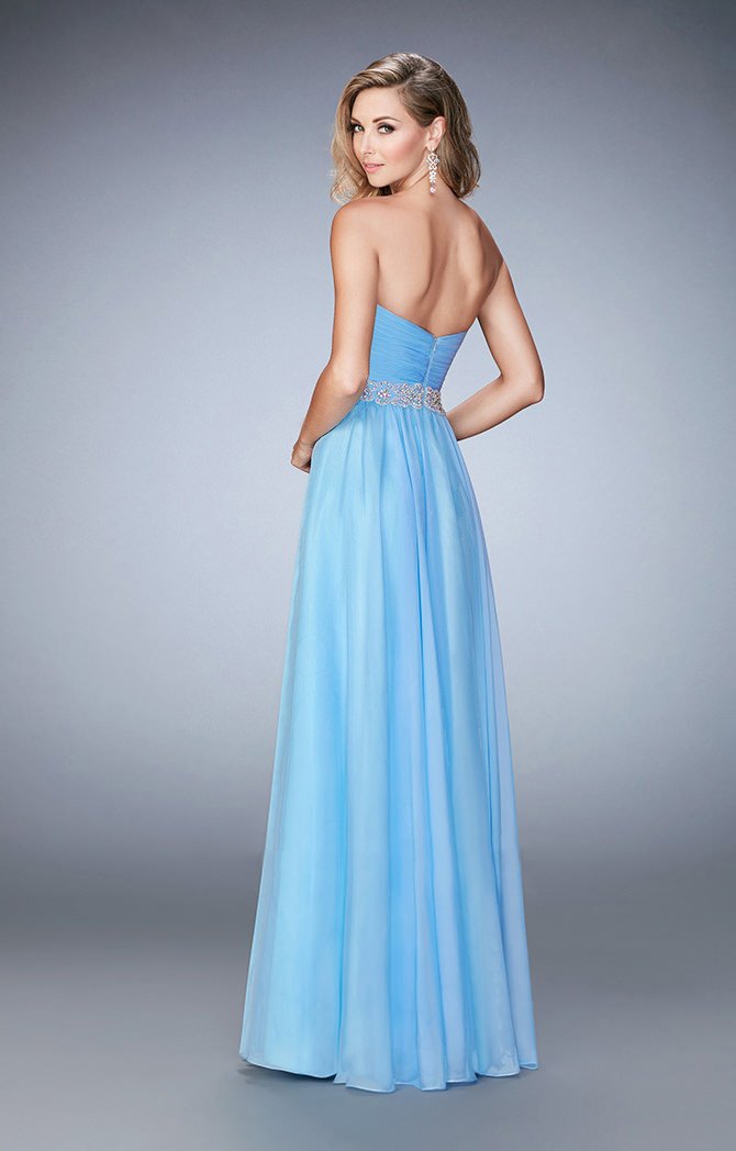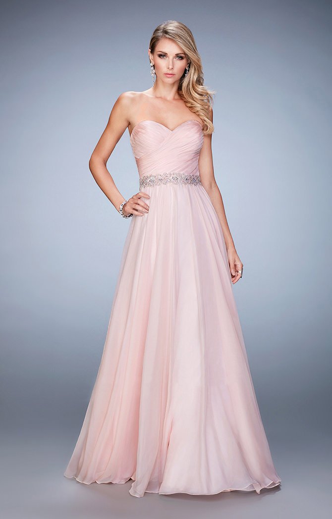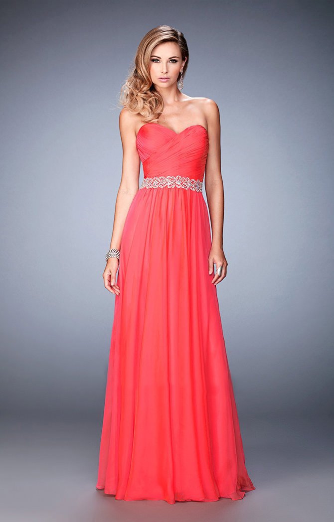 Heighten your charming appeal in this lavishly festooned La Femme 22786 creation. Beautiful pleats flourished a woven style on a ulpted bodice, this charming piece showcases a strapless sweetheart neckline and a straight-across open back. Crowned at the waist with a bejeweled band of florid details, the shirred A-line skirt flows in intricate pleats that completes in a flowing full-length hemline. Have all eyes get captivated with your sophisticate flair and poise in this La Femme masterpiece.