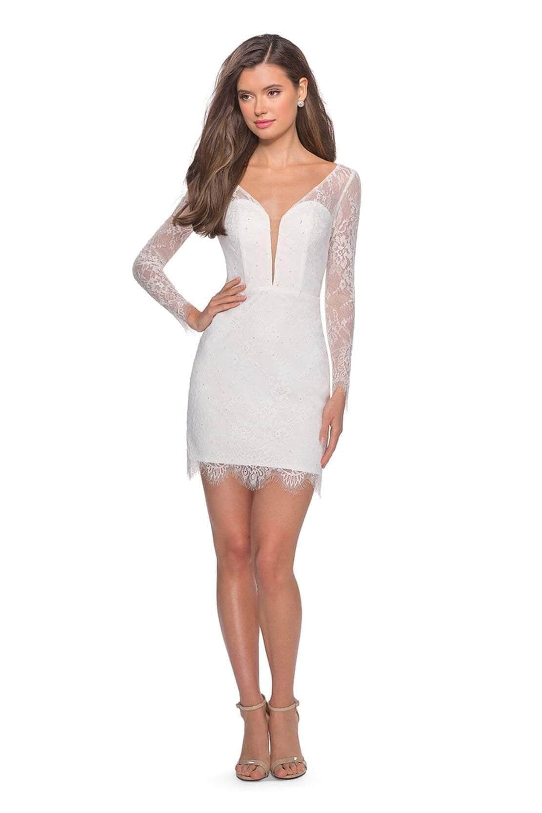 A plunging V neckline with sheer inset detail at the bust bisects the fitted bodice, framed with slender long sleeves. Sophisticatedly tailored in lace with scattered rhinestone embellishments, this dress parades a sheath silhouette that cascades to the mid-thigh length as it finishes with scalloped-eyelash trim hemline.