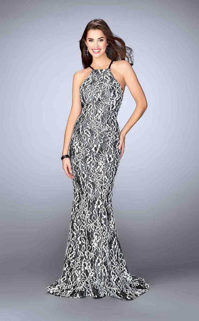 Embody an ethereal siren as you glide your way into every party with this high-contrast work of art by La Femme 23848. The alluring black and white lace dress features a high halter neckline and an open back with strap details and a back zipper closure. Clothe yourself in this chic beauty by La Femme and crown any event with your presence.