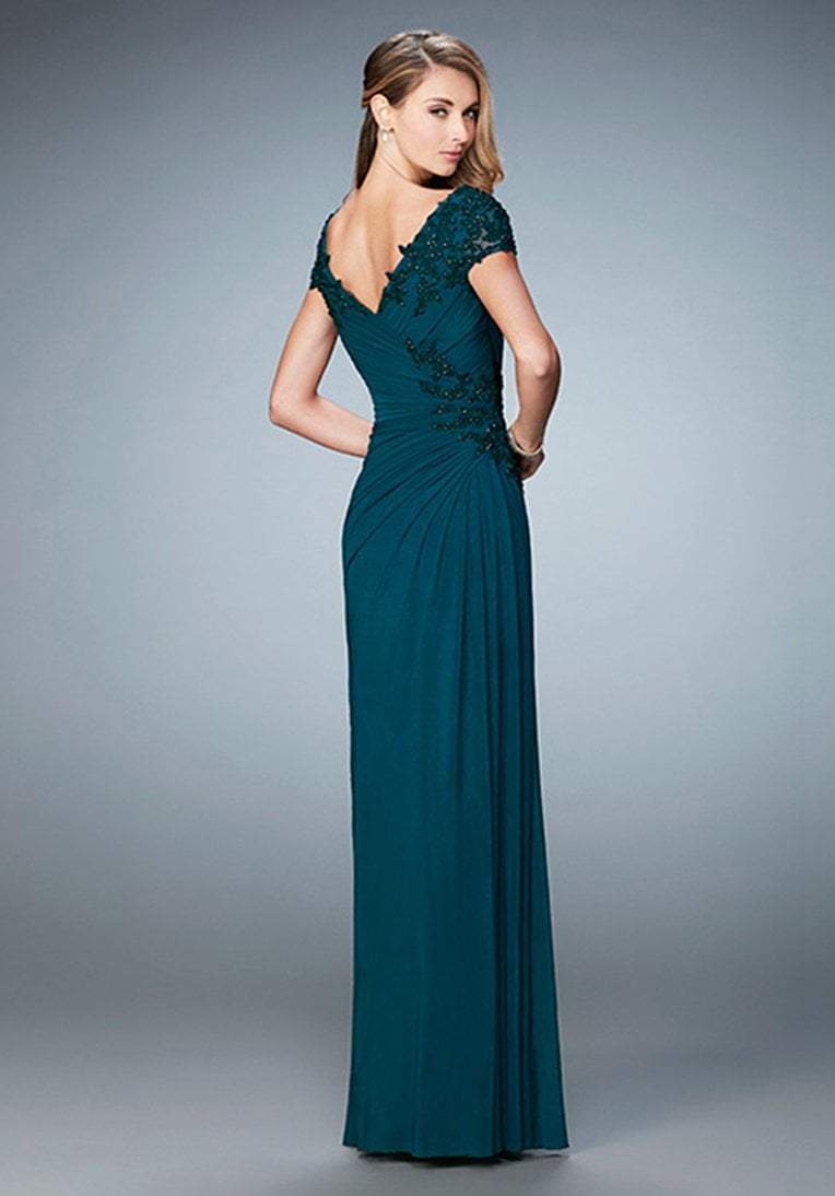 This dress has embellished cap sleeves and a modest V-neckline. Clustered beads decorate the shoulders draping over the cap sleeves. Ruching works throughout the bodice and a cluster of beaded applique sits at one side. The skirt is smooth with soft movement. This look finishes with a full length hem.