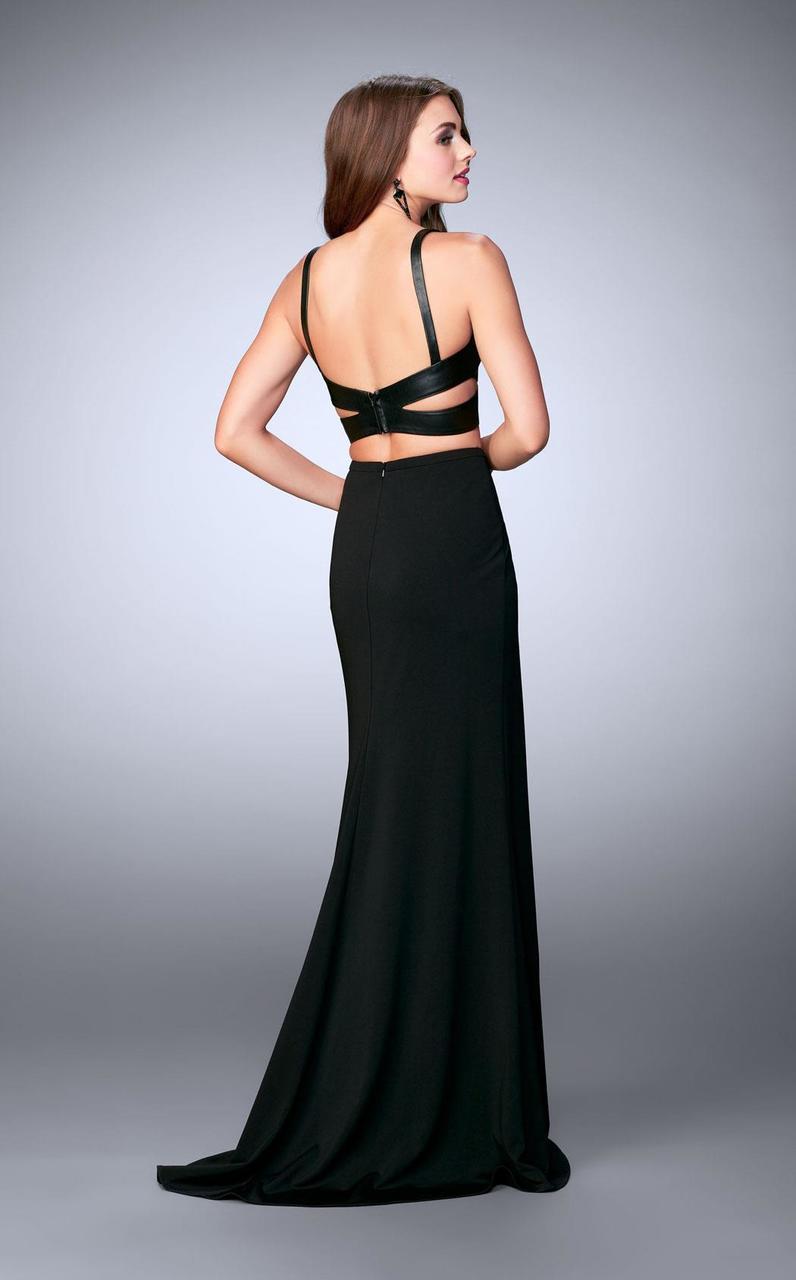 Enter any party and do that privilege walk of a regal beauty in this sultry La Femme 24036. This seductive form-fitting number flaunts a combination of soft jersey and vegan leather. The crop top has side cutouts, the skirt has a side slit and a back zipper closure. This exquisite La Femme creation is simply perfect for your next formal party!