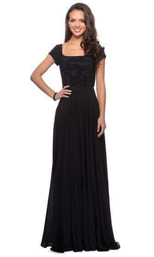 This unique dress delights in a square neckline with short sleeves. The fitted bodice is ornate with rhinestone embellishments and has a back zipper closure. Made of crepe chiffon, the skirt flourishes a full length A-line silhouette.