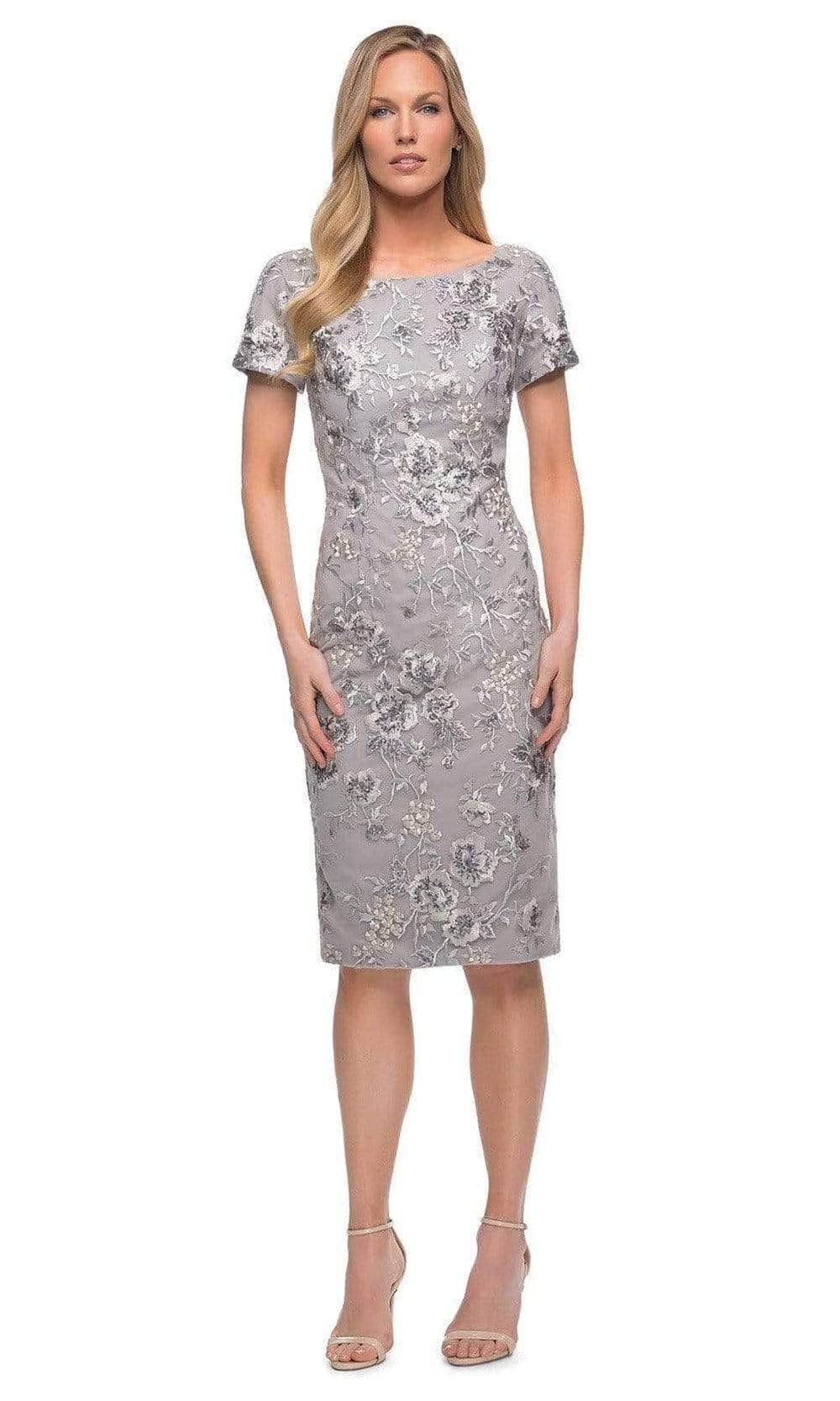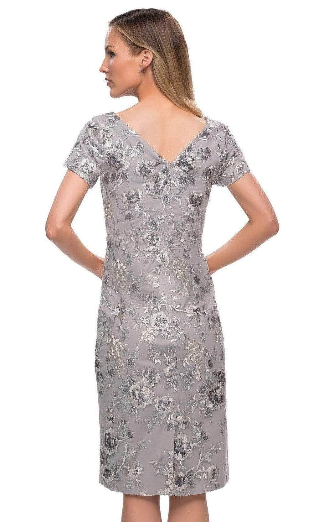 This formal and modest knee length dress flaunts a column silhouette and can be worn on semi-formal events. It features jewel neckline and V cut back while having short sleeves. Back zipper is used to close. Model is wearing the Silver color.
