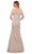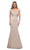 This dress displays a modified V-neckline supported by short sleeves in a fitted bodice. Revealing a trumpet silhouette, this also shows a V back with back zipper closure to complete the look. Model is wearing the Silver color.