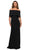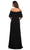 This jersey long dress showcases an off-shoulder neckline and elbow length sleeves as the mid-open back is secured with a center zipper closure. The skirt parades a column silhouette which graces to a full length hemline, completed with a sweep train. Model is wearing the Black color.