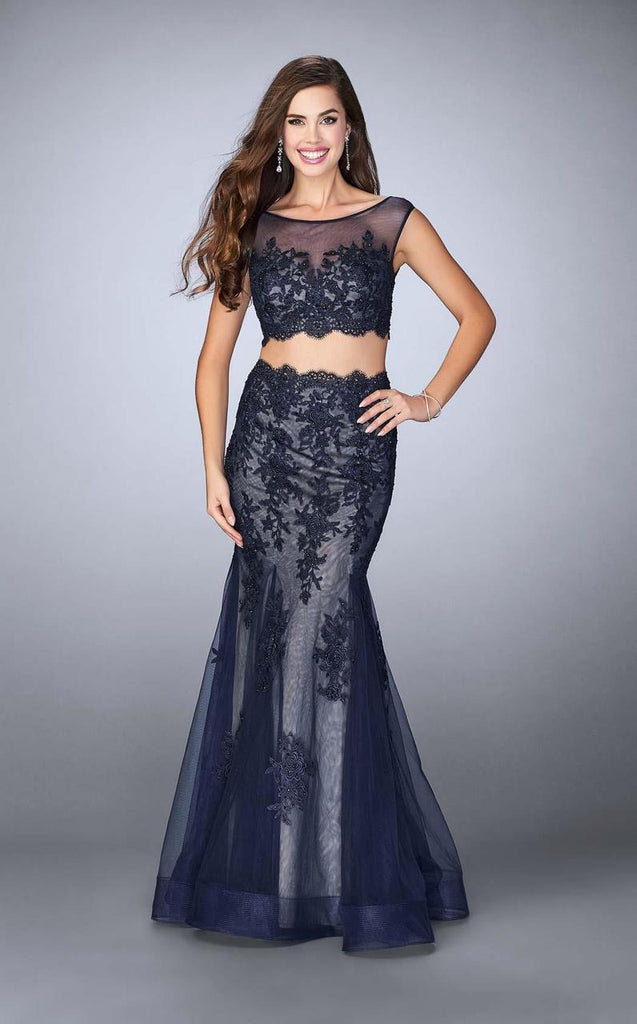 Make the most mind-blowing arrival at any special occasion in this radiant lace number by La Femme 23461. The alluring lace ensemble displays scallop framing on the top and skirt. The filmy skirt shows a tonal lace fading down, horsehair on the hem and a back zipper closure. Lavish yourself in a look of pure femininity with this impeccable lace creation by La Femme.