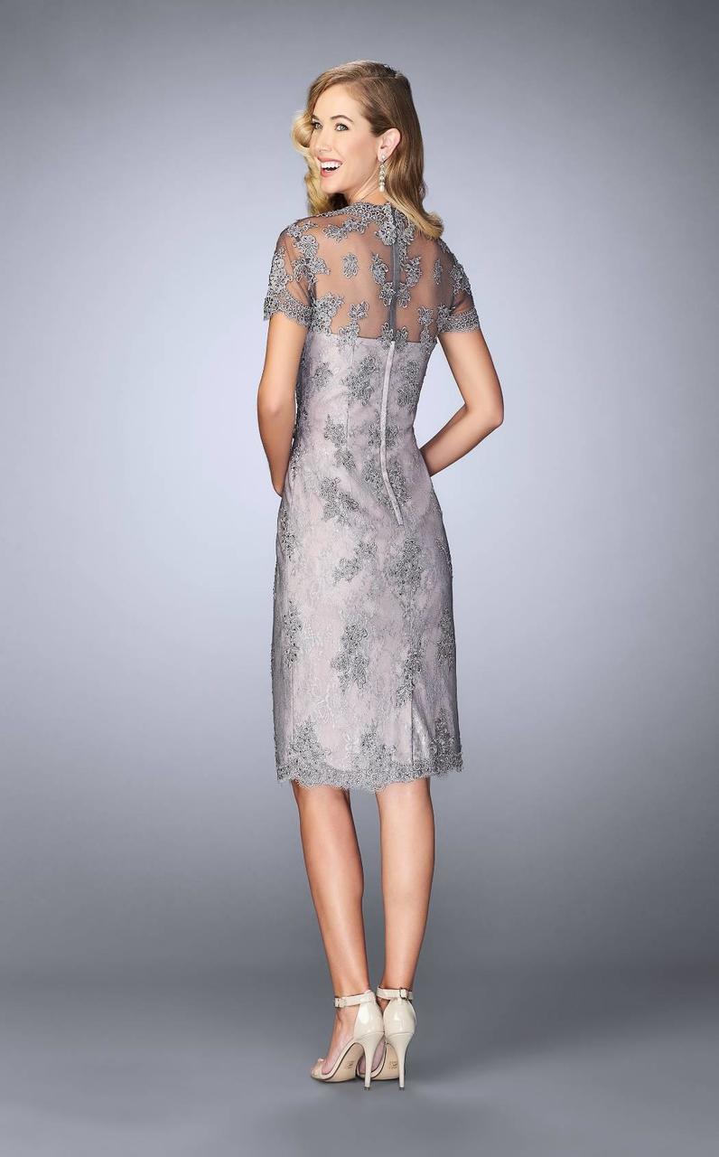 Made of rich lace fabric, this cocktail dress features a V-neckline with scalloped and short sleeves covering just enough of your shoulders. The bodice is fitted and moves into a column skirt with ornate applique. The skirt finishes with a modest hem.