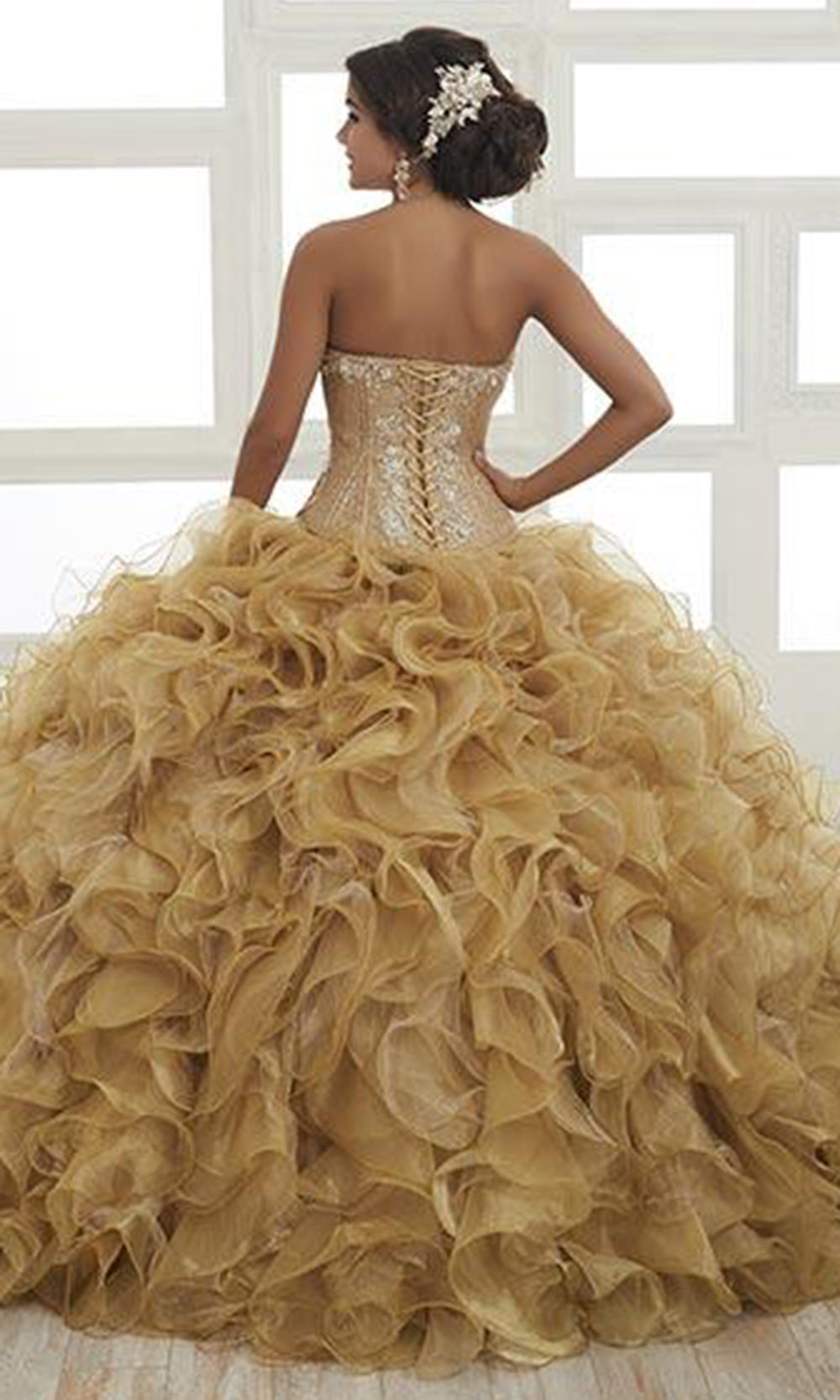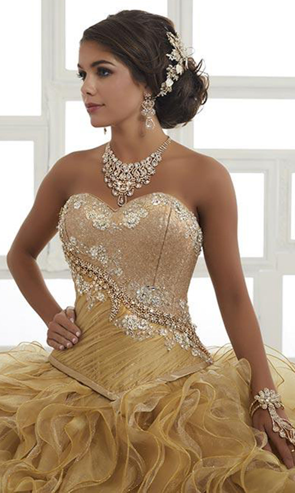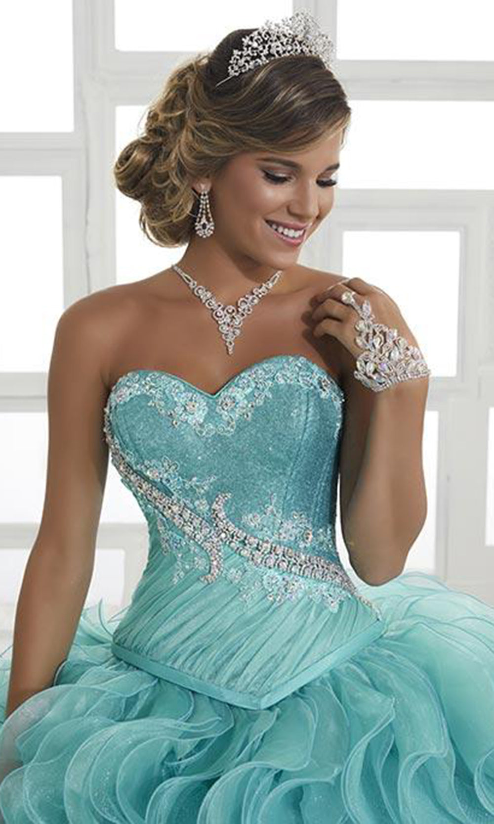 Be at the front and center of everyone’s attention in this LA Glitter 24025 creation. Adorned with sequins and rhinestones, this gown flourishes a strapless sweetheart neckline with asymmetrical patterned organza ruching. Flaunting a fitted bodice that tapers into a basque design, the back is nipped with a lace up detail. Glamorously volumized with ruffle adornments made of glitter tulle and organza, the ballgown skirt falls into a court train. Flaunt pure decadence and style in this sensational LA Glitter masterpiece.