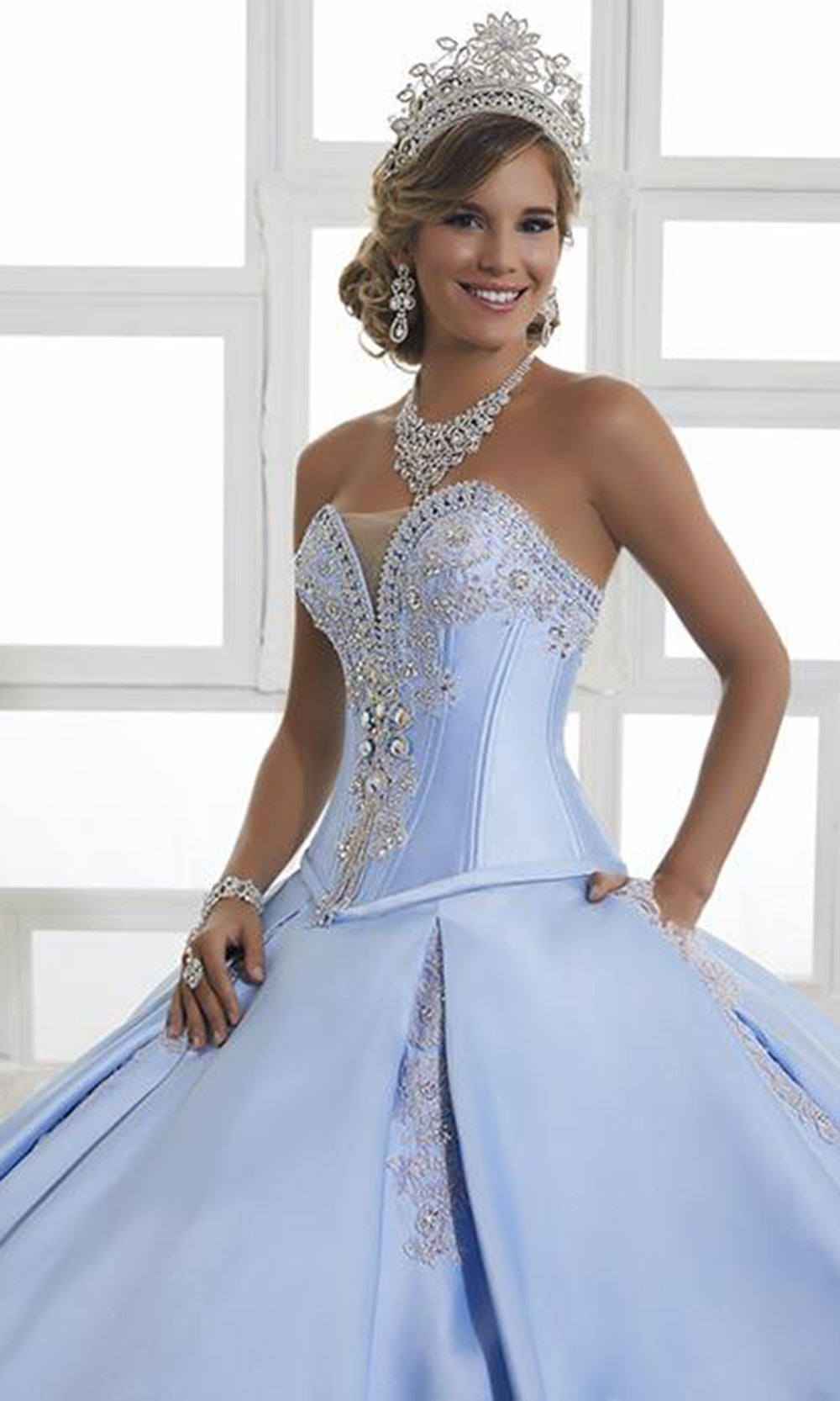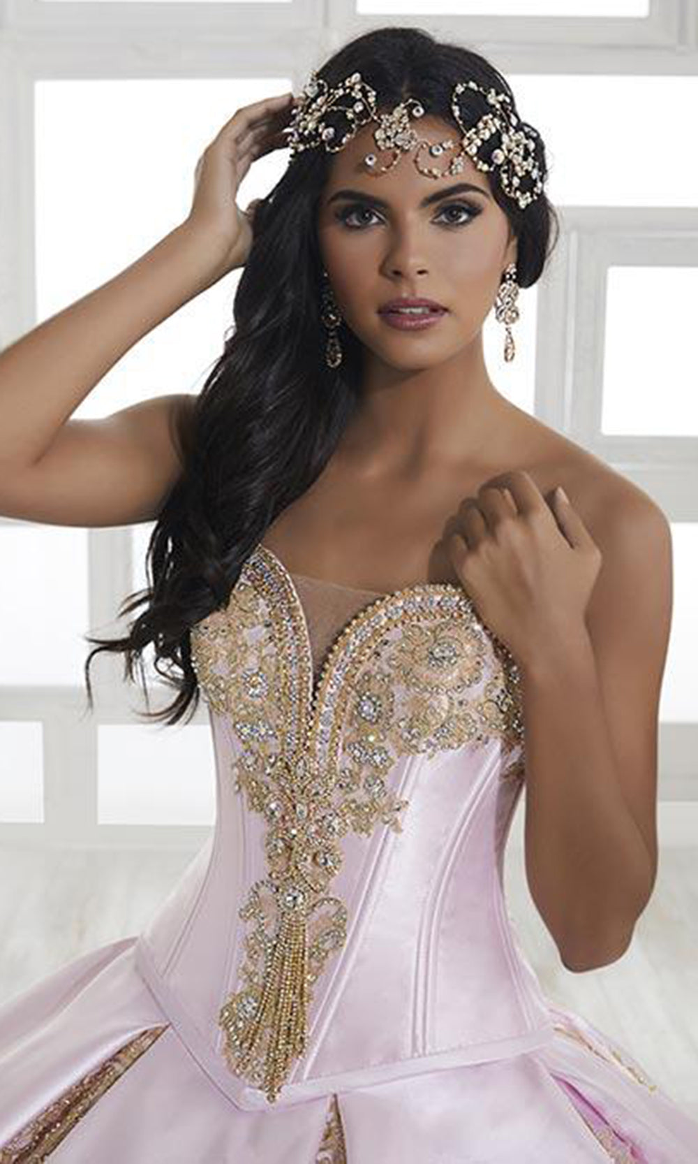 Be glorified as the belle of the ball in this fascinating LA Glitter 24029 creation. Brilliantly ornamented with an intricate jeweled spectacle, this corset bustier reveals a plunging sweetheart neckline with an illusion inset. A lace up detail sculpts the bodice. Intricate beaded appliques glamourizes the folds as pleats of Mikado rushes to the floor with a ribbon appliqued train. Lavish in the sheer romance of this fascinating LA Glitter masterpiece.